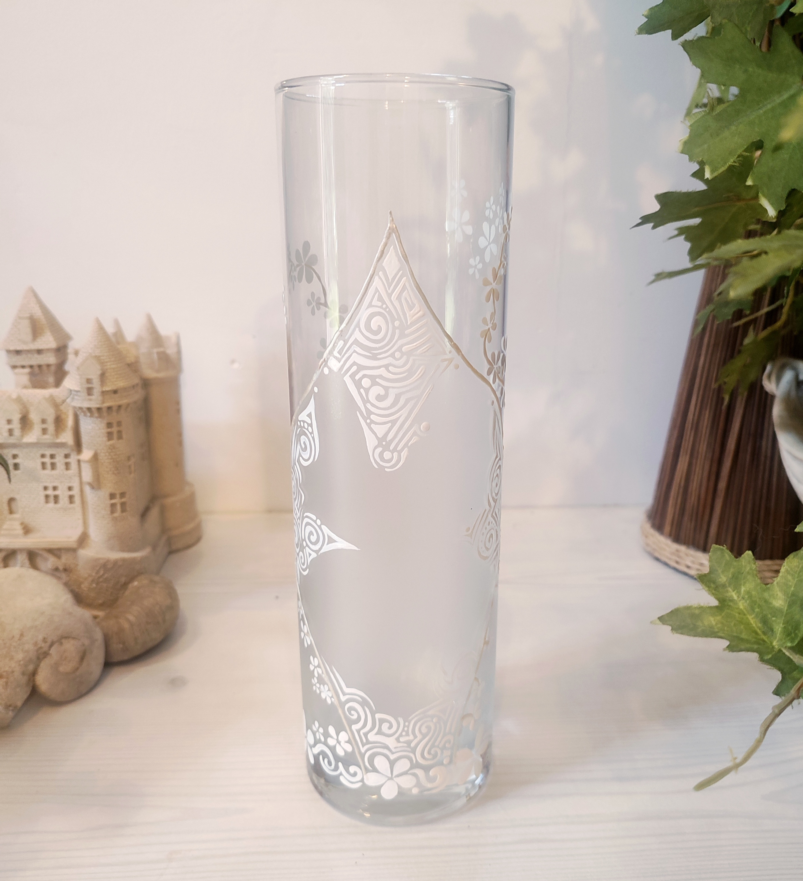 Très joli vase peint à la main avec un effet verre poli. De jolies volutes de fleurs blanches grimpent le long de la paroi du vase. Un serti couleur blanc nacré court sur le verre afin de faire ressortir les décors.