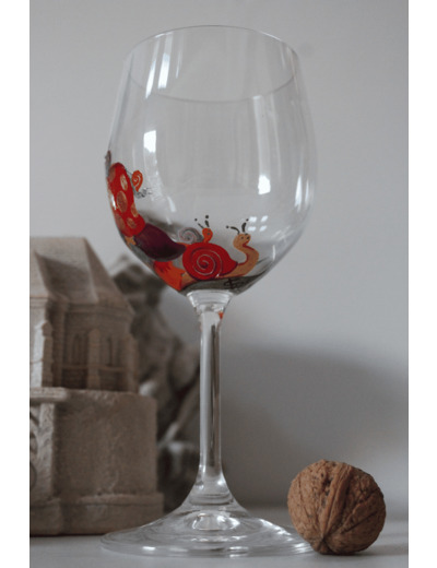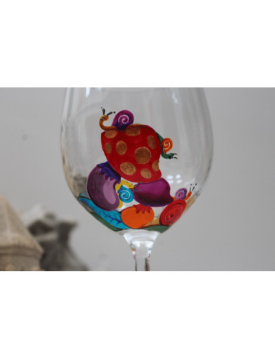 Verre ballon original en cristal de bohème personnalisable entièrement peint à la main sur le thème des gastéropodes. Scènette automnale très colorée où l'on observe de sympathiques petits escargots se promenant au milieu des champignons. Chaque verre est unique en son genre, signé et numéroté par catégorie. Ils sauront égayer vos moments festifs à table, autour d'un bon repas.