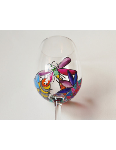 Verre original en cristal entièrement peint à la main sur le thème des coccinelles, libellules et bourdon. Scène colorée où l'on observe de sympathiques petits insectes qui tout en se promenant dans le feuillage nous observent d'un air intéressé. Chaque verre est unique en son genre, signé et numéroté par catégorie. Ils sauront égayer vos moments festifs lorsque vous vous retrouverez à table avec votre famille et vos amis, autour d'un bon repas.