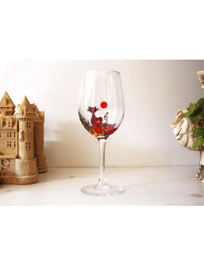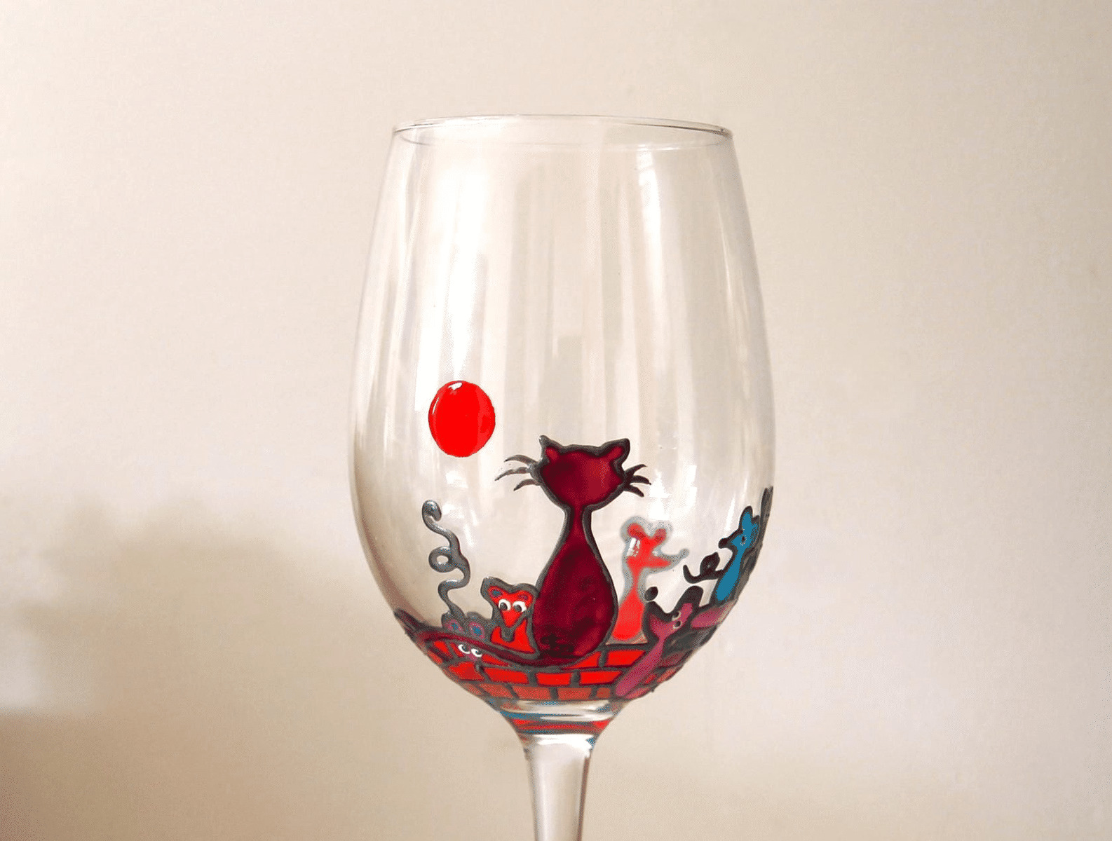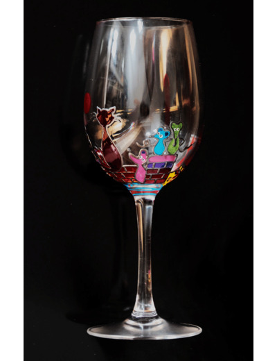 Joli Verre À Vin Très Coloré En Cristal Peint À La Main Sur Le Thème Des Chats Et Des Souris, Pièce Originale Et Unique