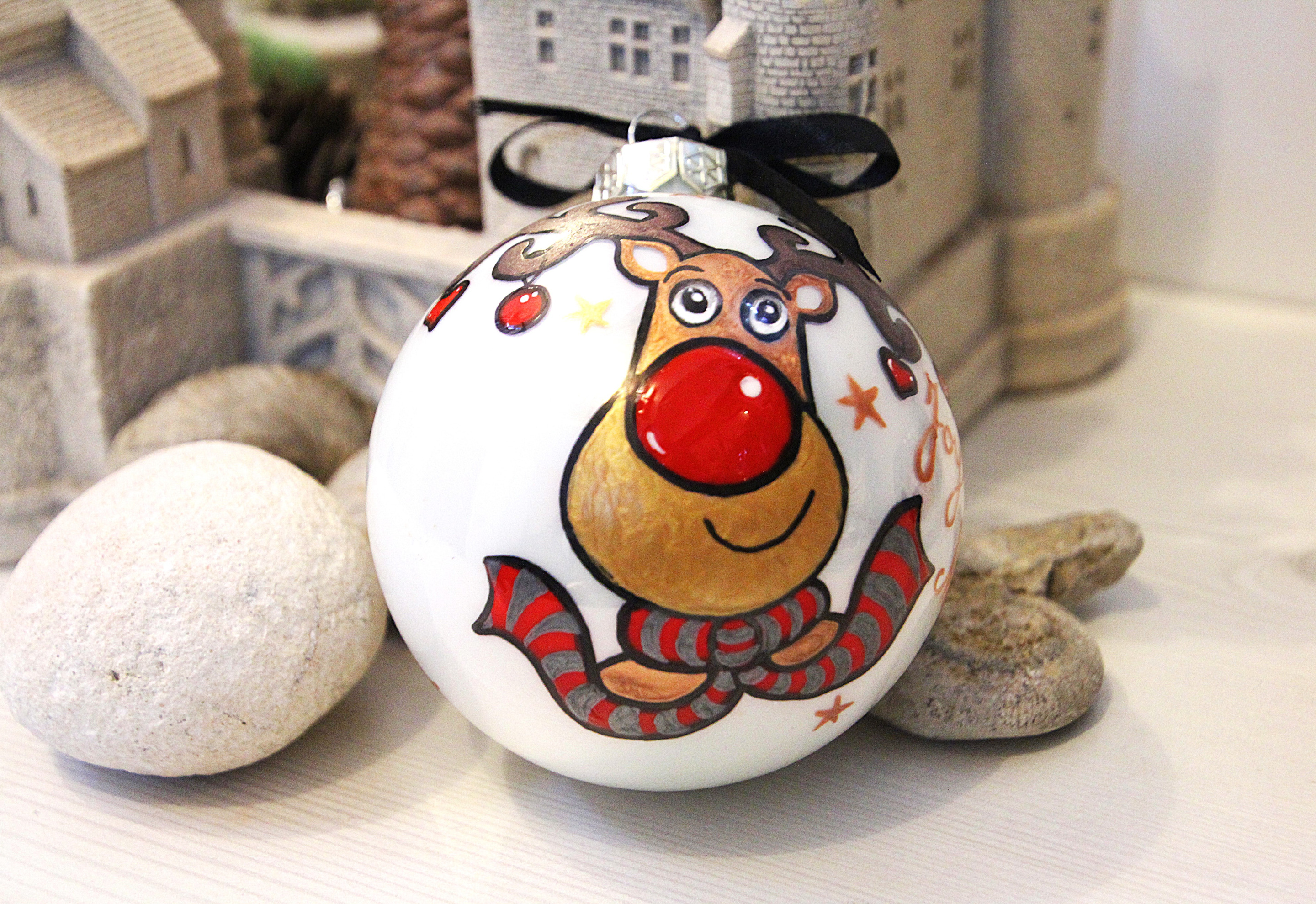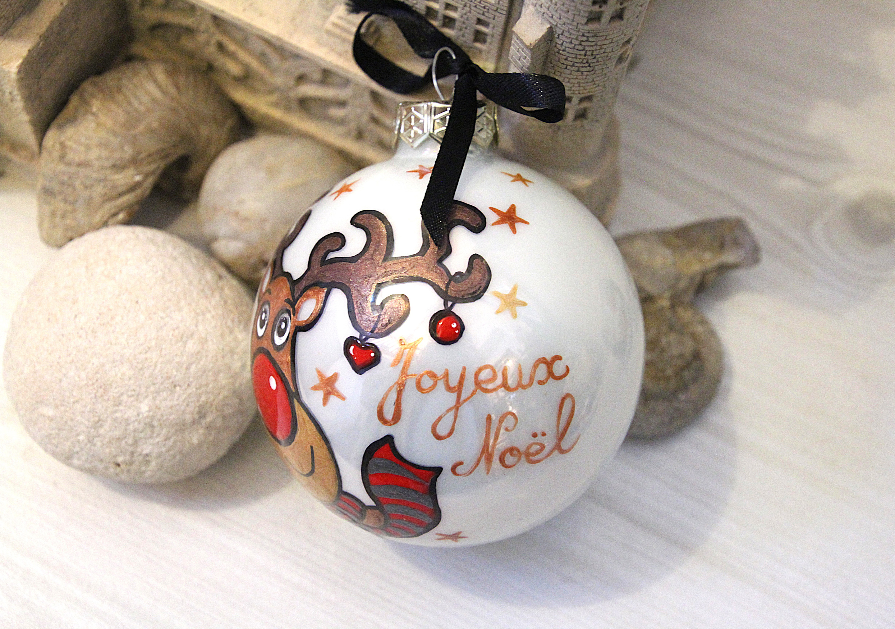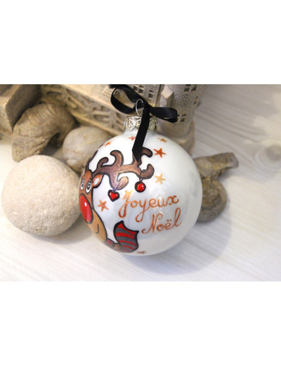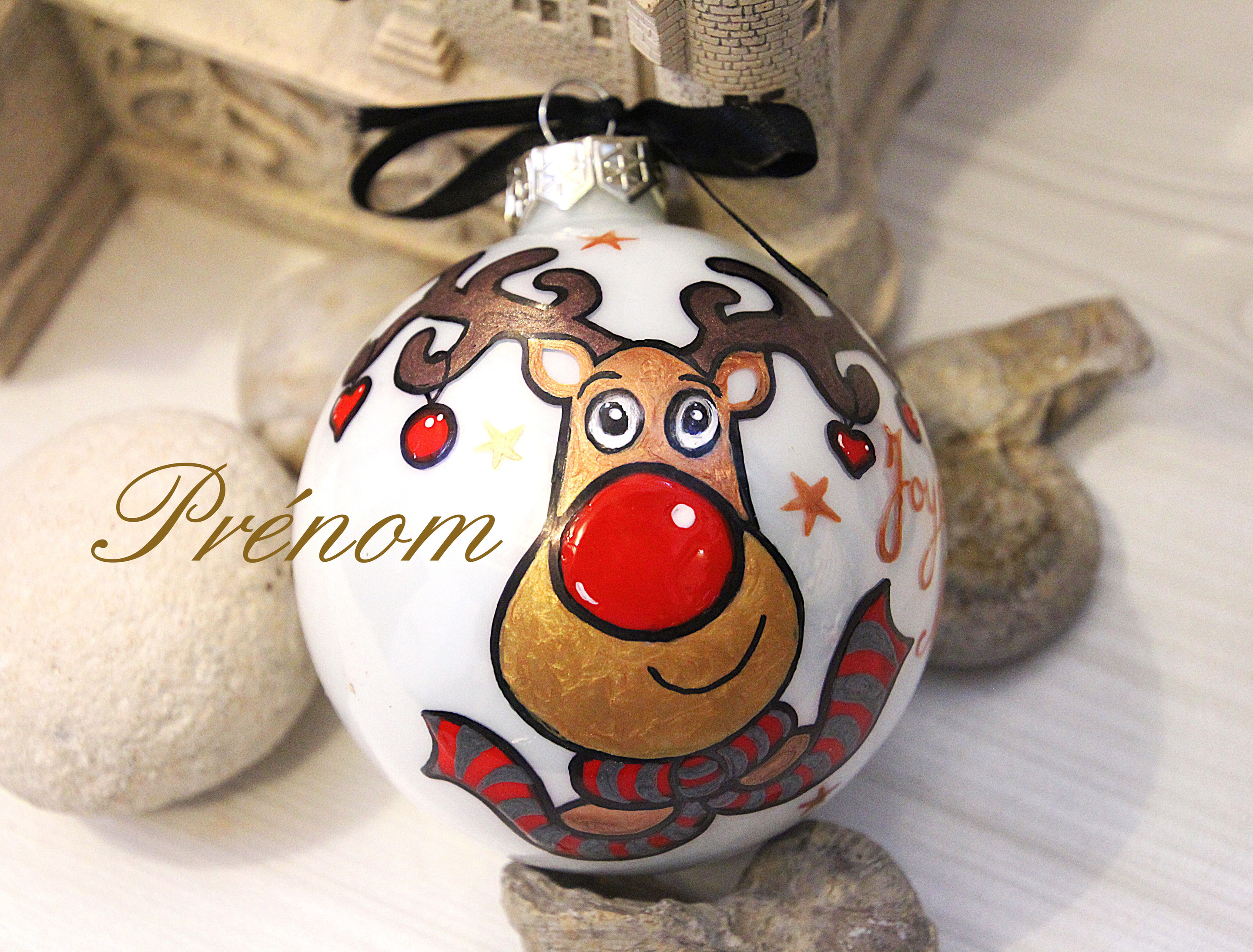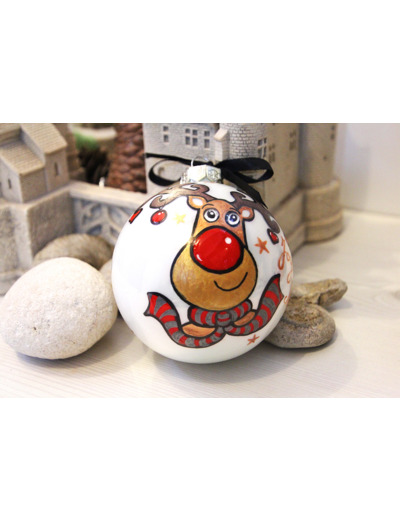 Quel joli cadeau que cette boule de noël en verre peinte à la main personnalisable et unique de 9 centimètres de diamètre à suspendre dans votre sapin. Un petit renne coquin joue avec les boules de noël du sapin.
