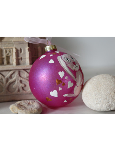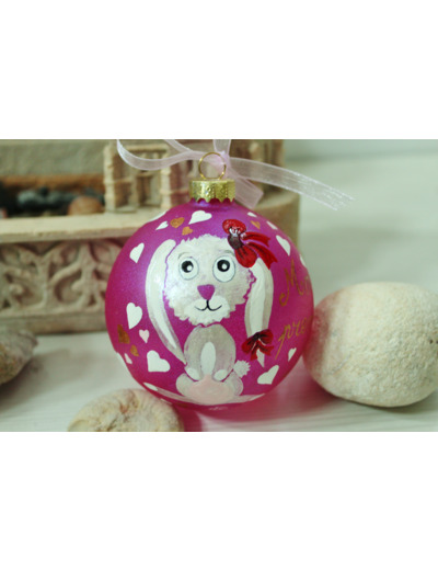 Décoration de noël en verre peinte à la main, boule de noël personnalisable et unique, 8 centimètres de diamètre, à suspendre dans votre sapin. Un charmant petit lapin veillera sur vous la nuit de Noël !