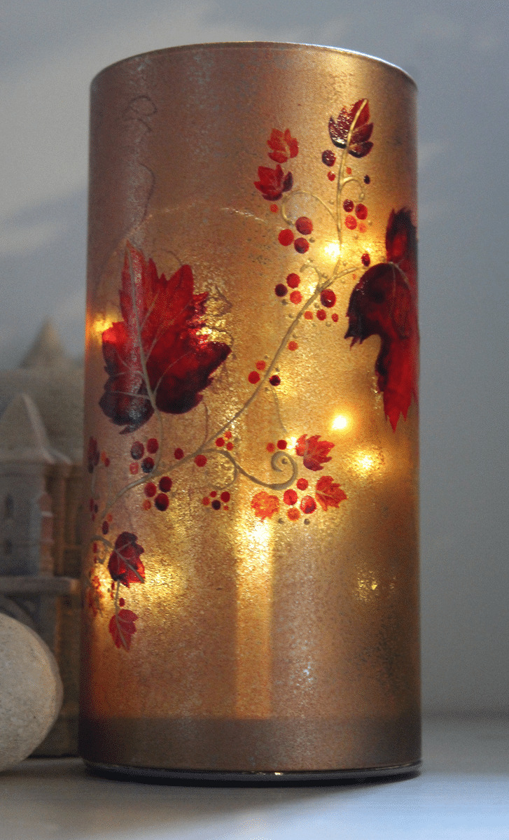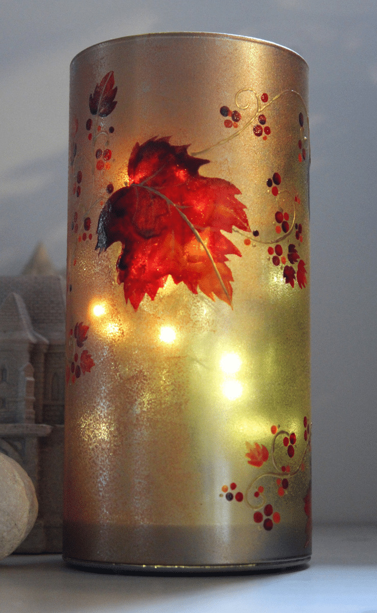 Jolie Lampe Peinte Aux Couleurs Chaudes De L'automne, Originale, Signée Et Numéroté, Une Guirlande De Feuilles D'automne Sillonnent La Paroi