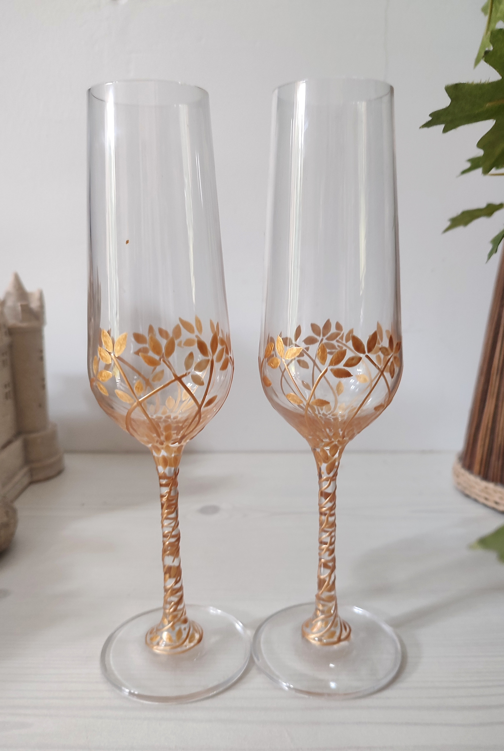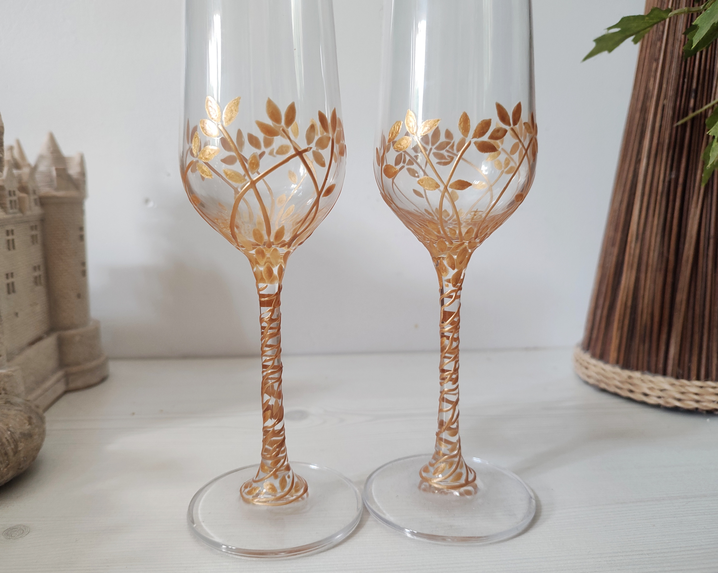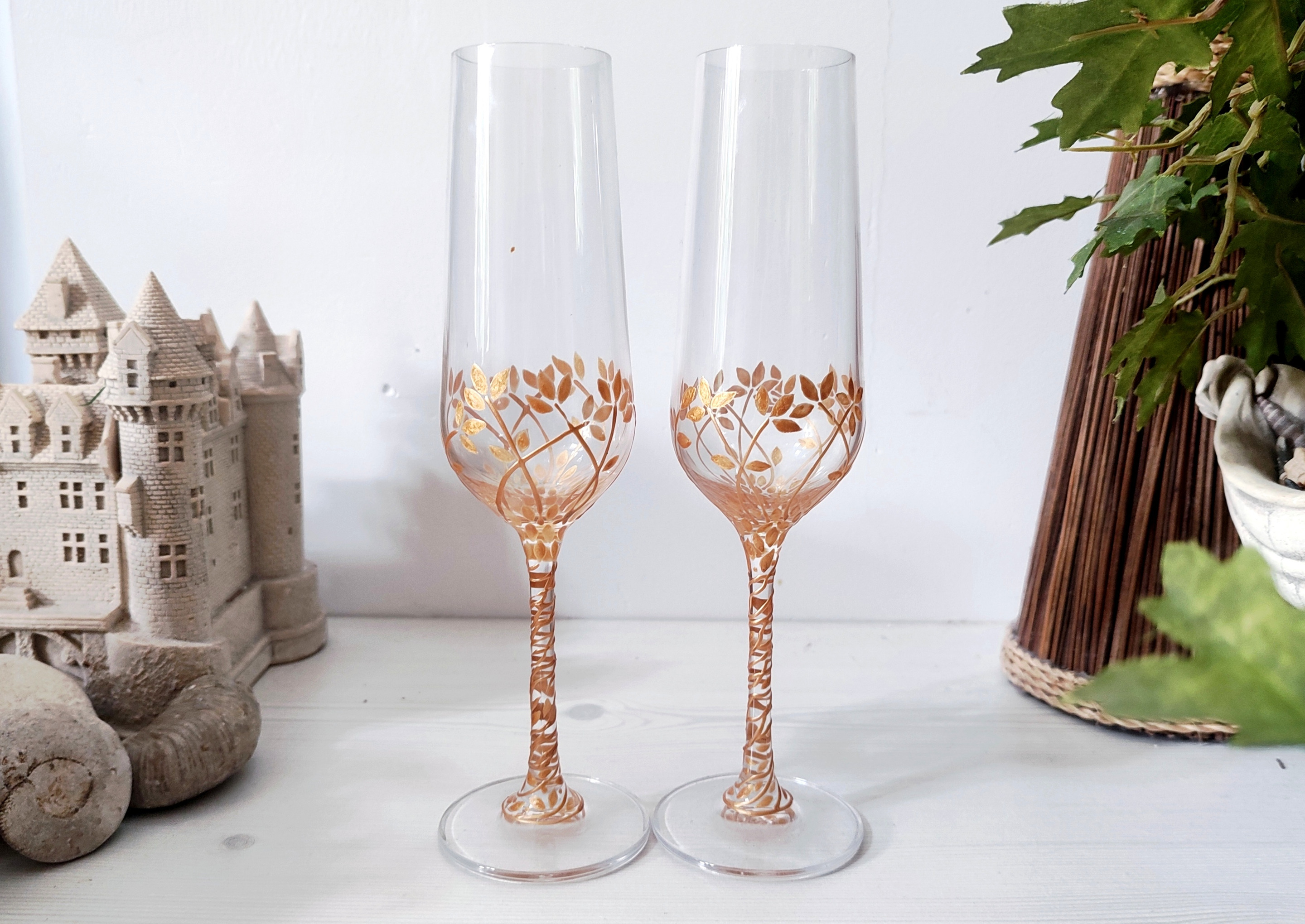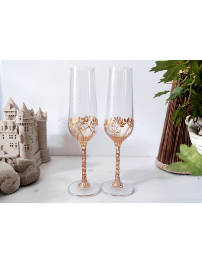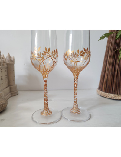 Duo de deux jolies flutes au coloris or représentant un arbre et son joli feuillage doré. Un enchevêtrement de racines grimpe le long du pied du verre.