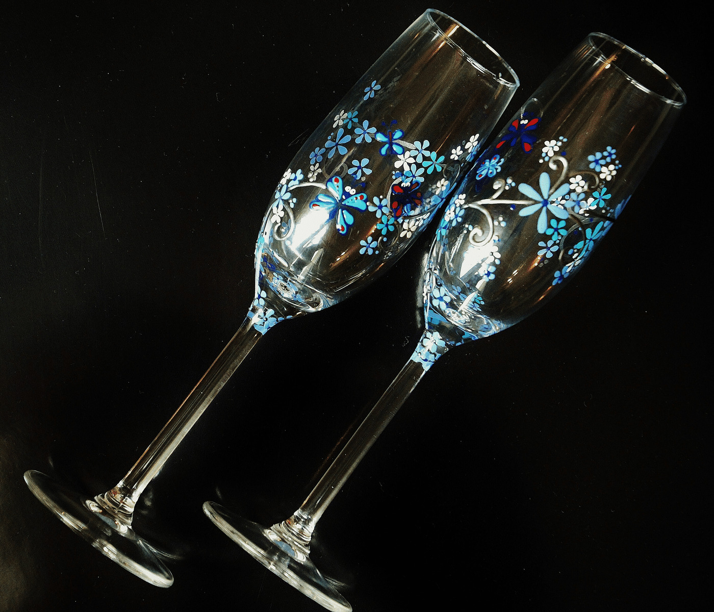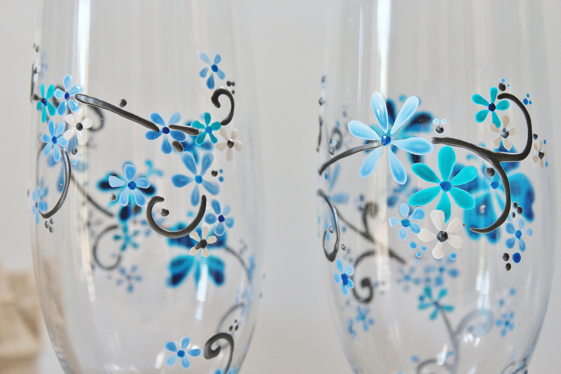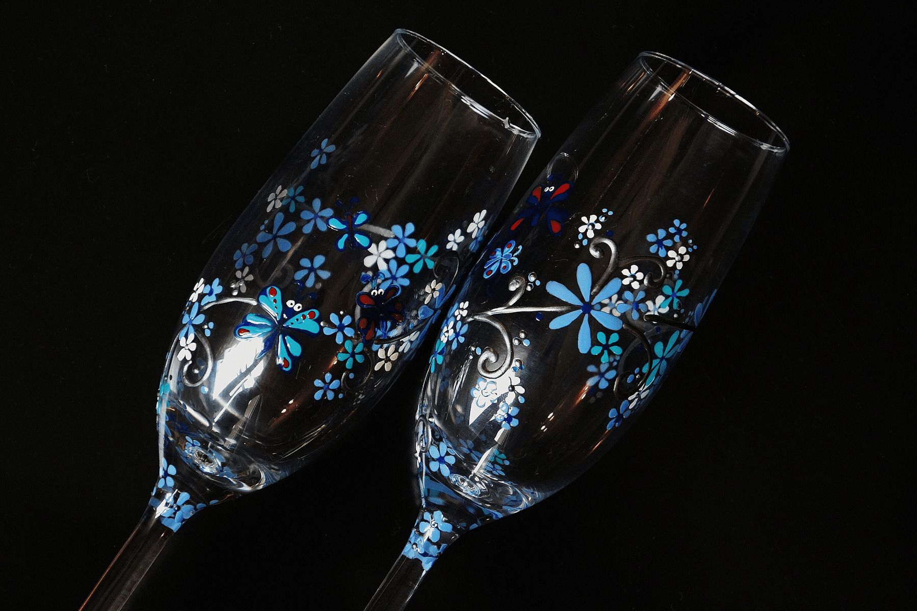 Lot De Deux Jolies Flutes Peintes À La Main Artisanalement Sur Le Thème Des Papillons Bleus Turquoises Verres Personnalisables Et Uniques