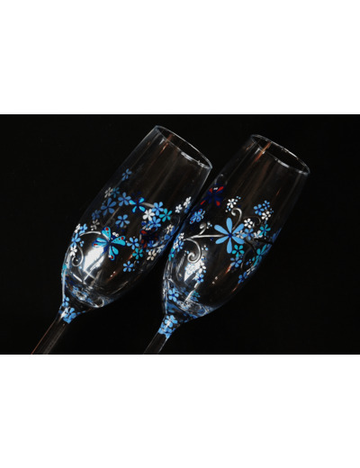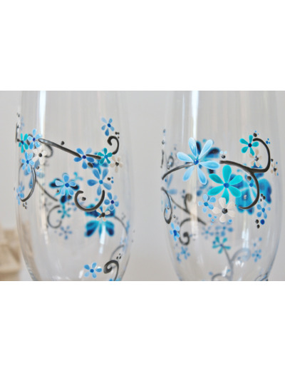 Duo de deux jolies flutes à champagne dans les tons bleus turquoise décorées d'une guirlande de petites fleurs et de papillons bleus. Ces verres peuvent être personnalisés du prénom de votre choix ou d'initiales. Quel joli cadeau original à faire pour un mariage ou lors d'un anniversaire !