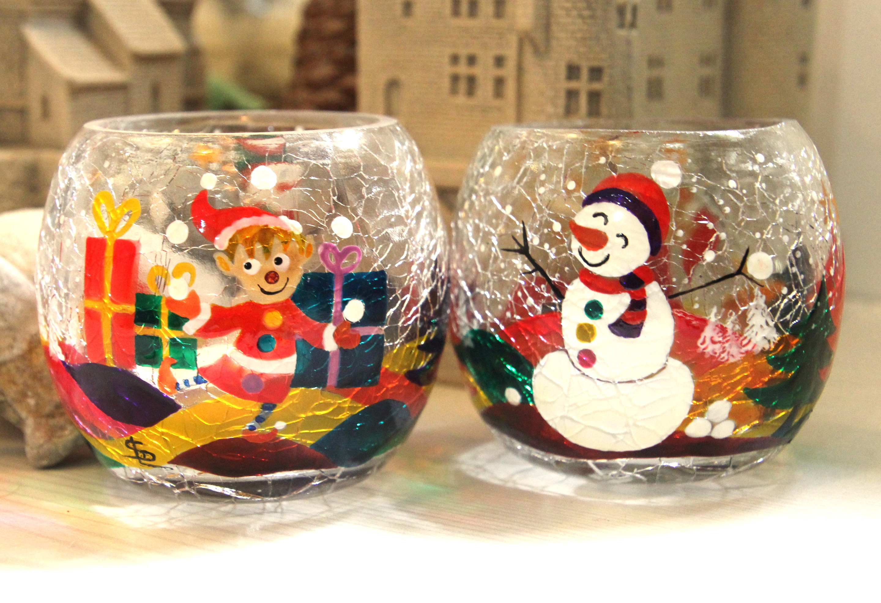 Photophore en verre craquelé peint à la main sur le thème de Noël - Peuvent être vendus par lot de deux