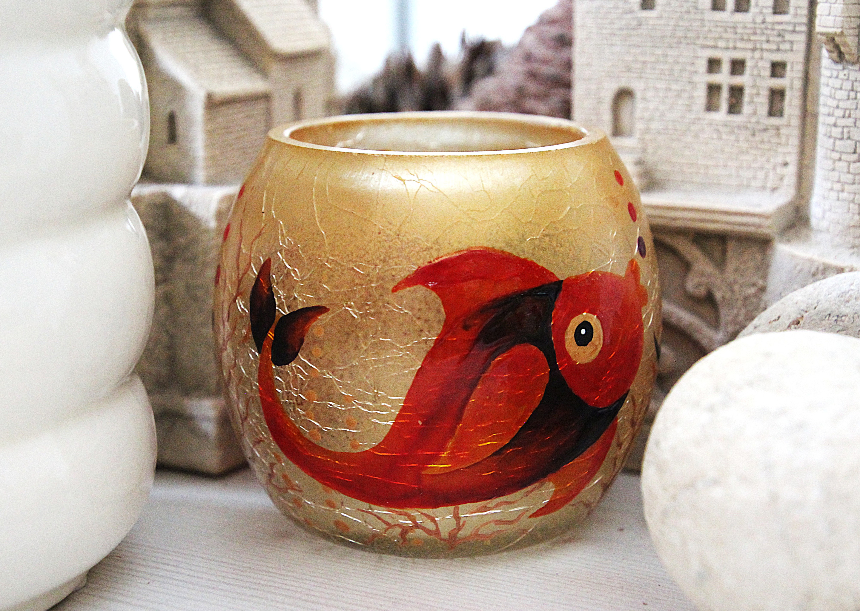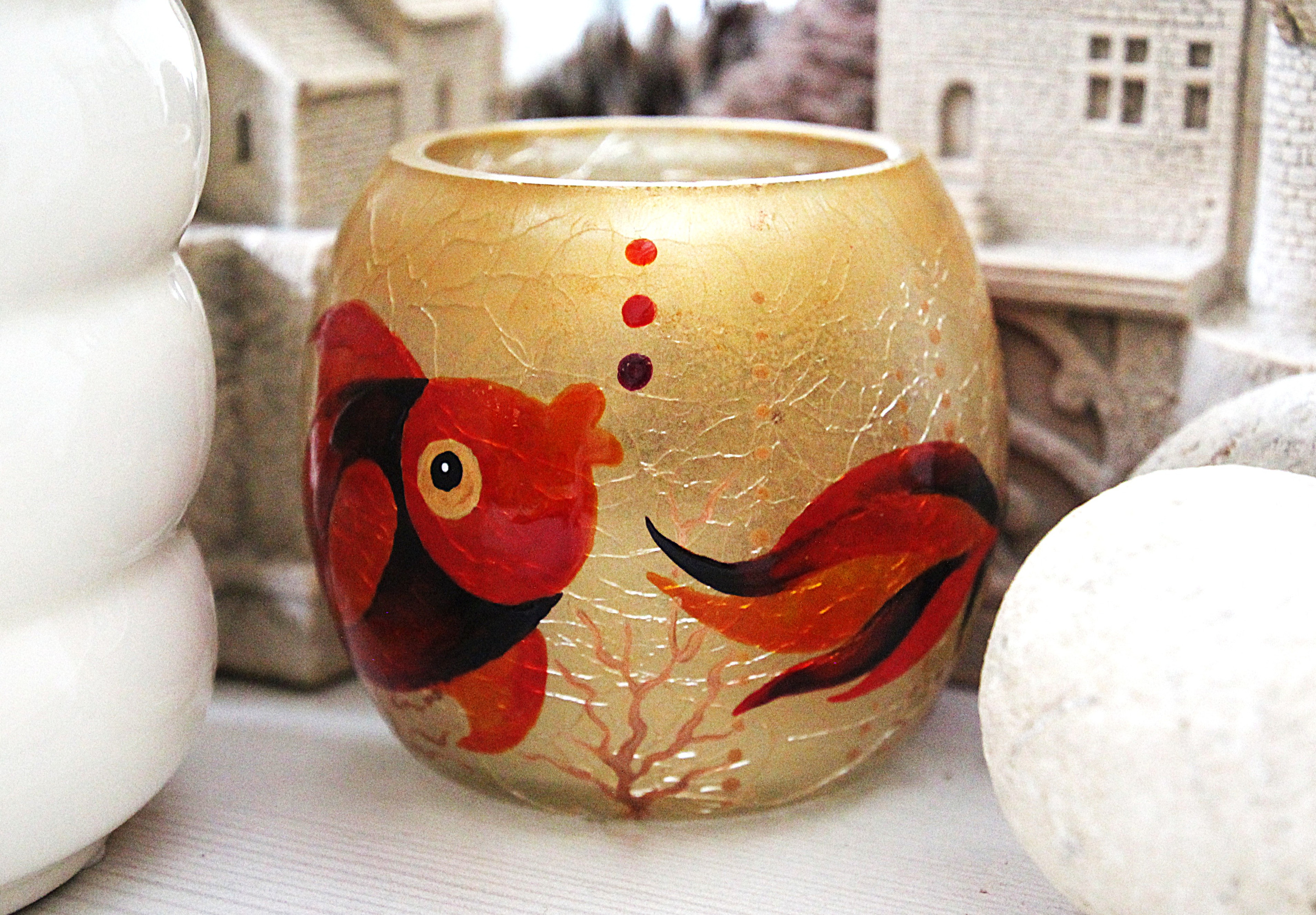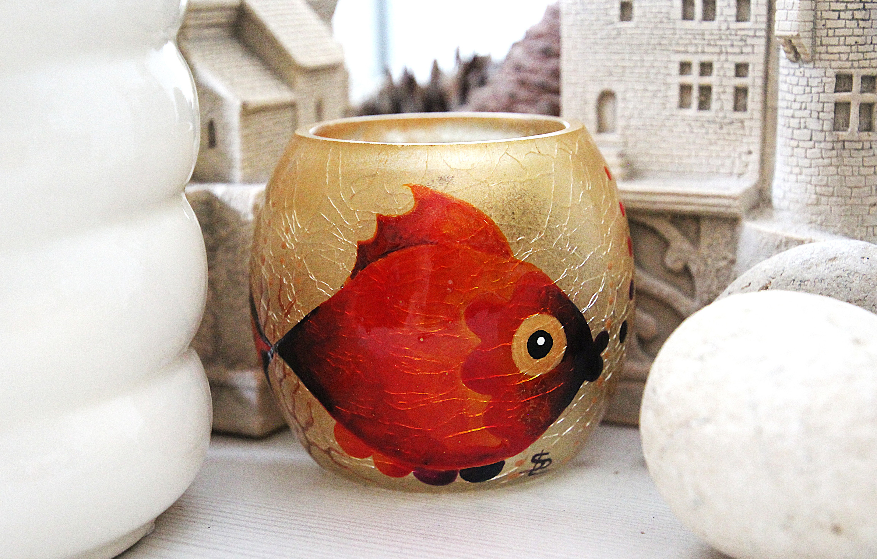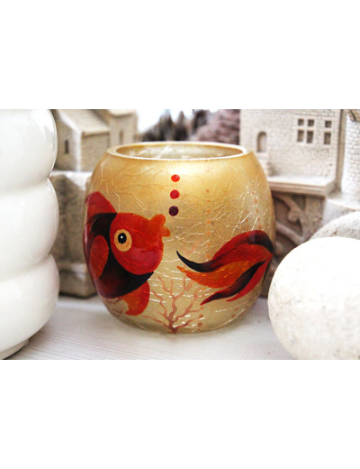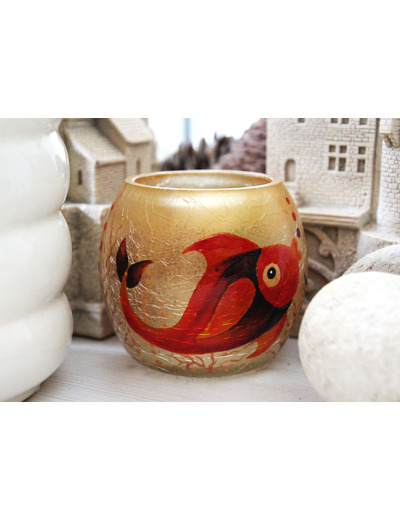 Joli photophore peint à la main sur le thème des poissons. Cet objet en verre feuilleté, craquelé, a été cuit au four pour une meilleure tenue.