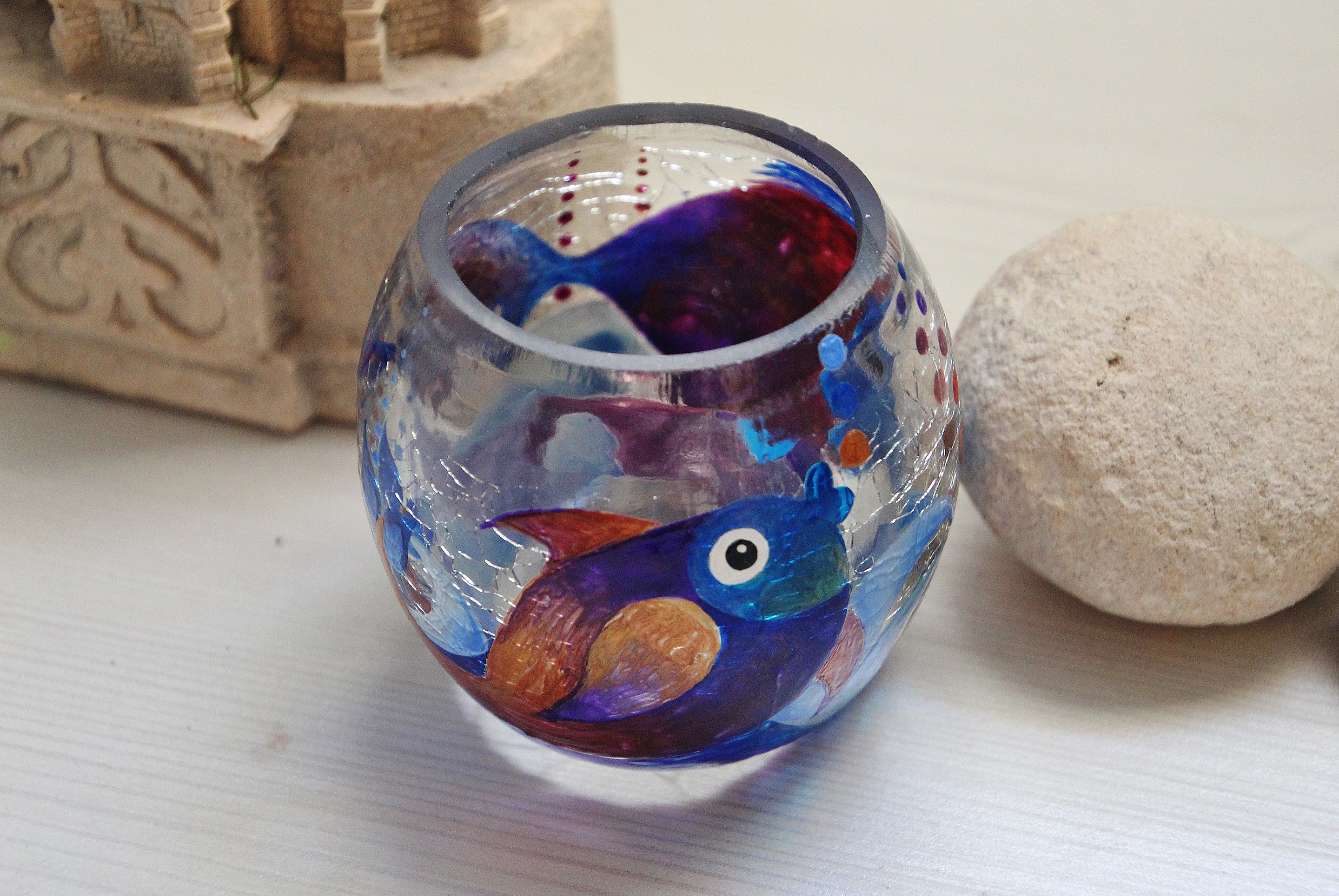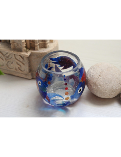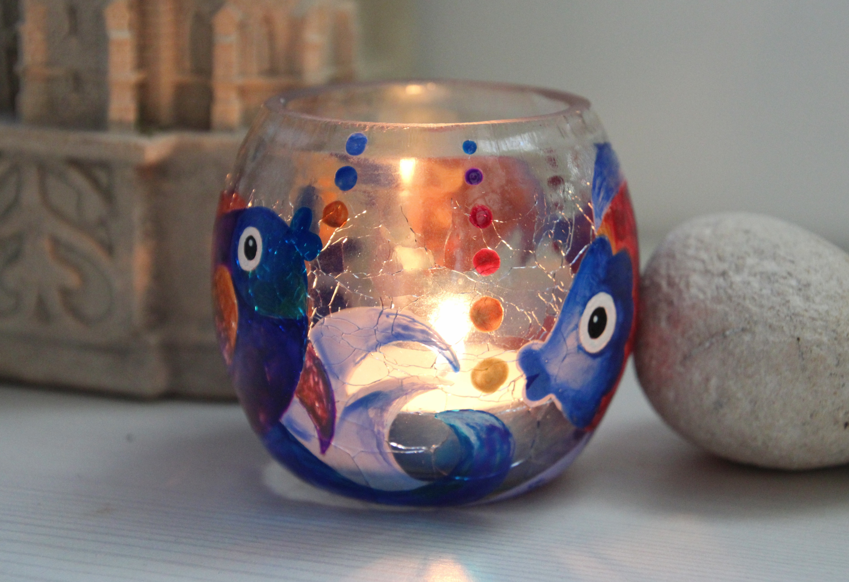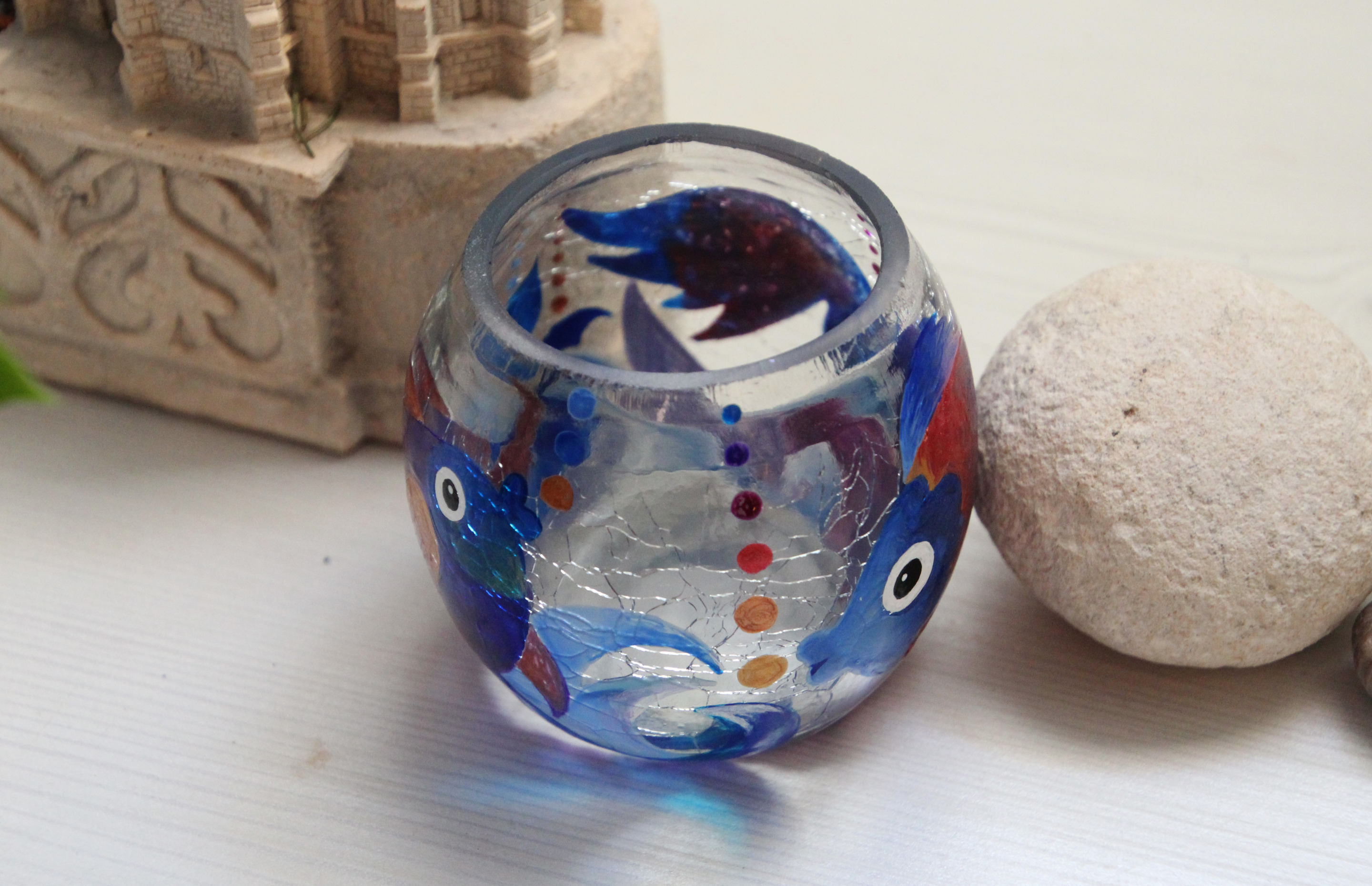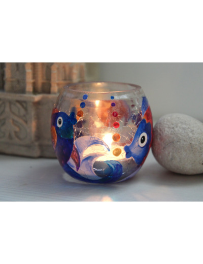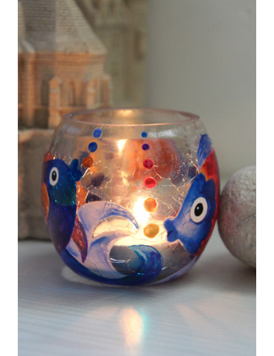 Joli photophore peint à la main sur le thème des poissons. Cet objet en verre feuilleté, craquelé, a été cuit au four pour une meilleure tenue.