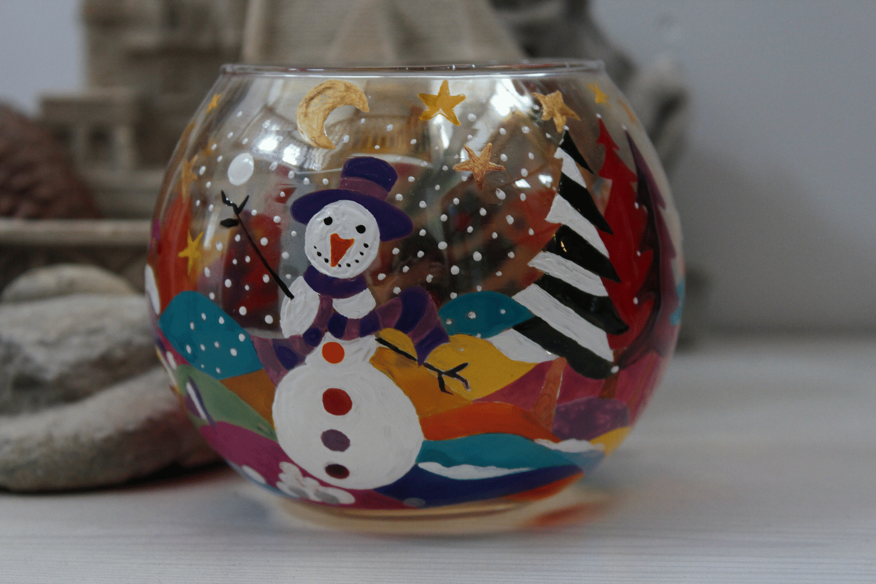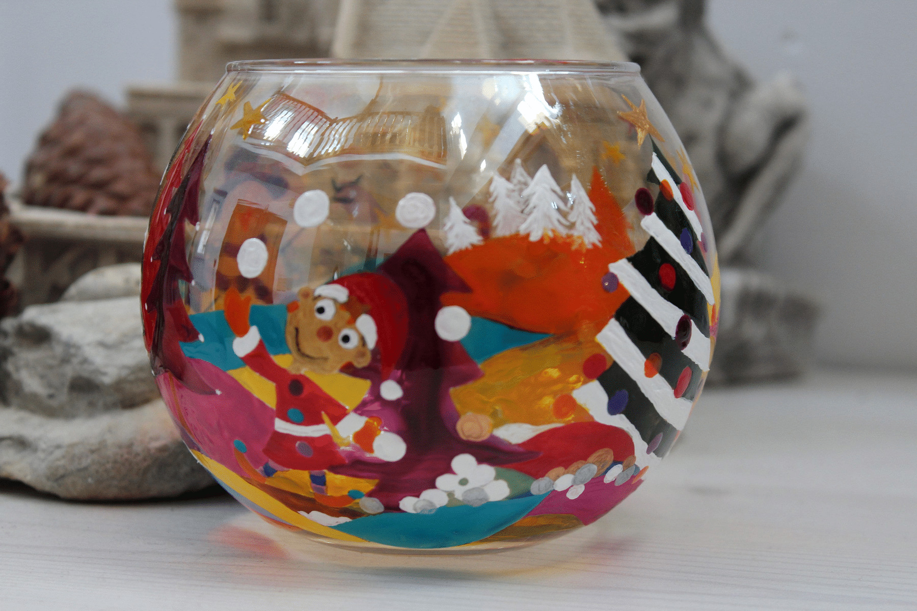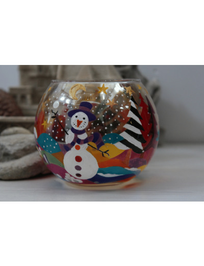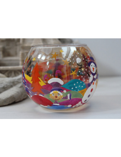Photophore de Noël très décoratif et unique entièrement peint à la main dans un décor blanc et enneigé mais aussi très coloré grâce à ses petits lutins qui courent et jouent avec des boules de neige au milieu des sapins de noël. Ce photophore très gai peut être utilisé avec des bougies flottantes.