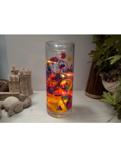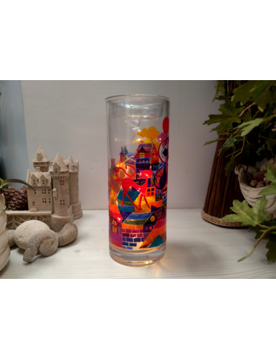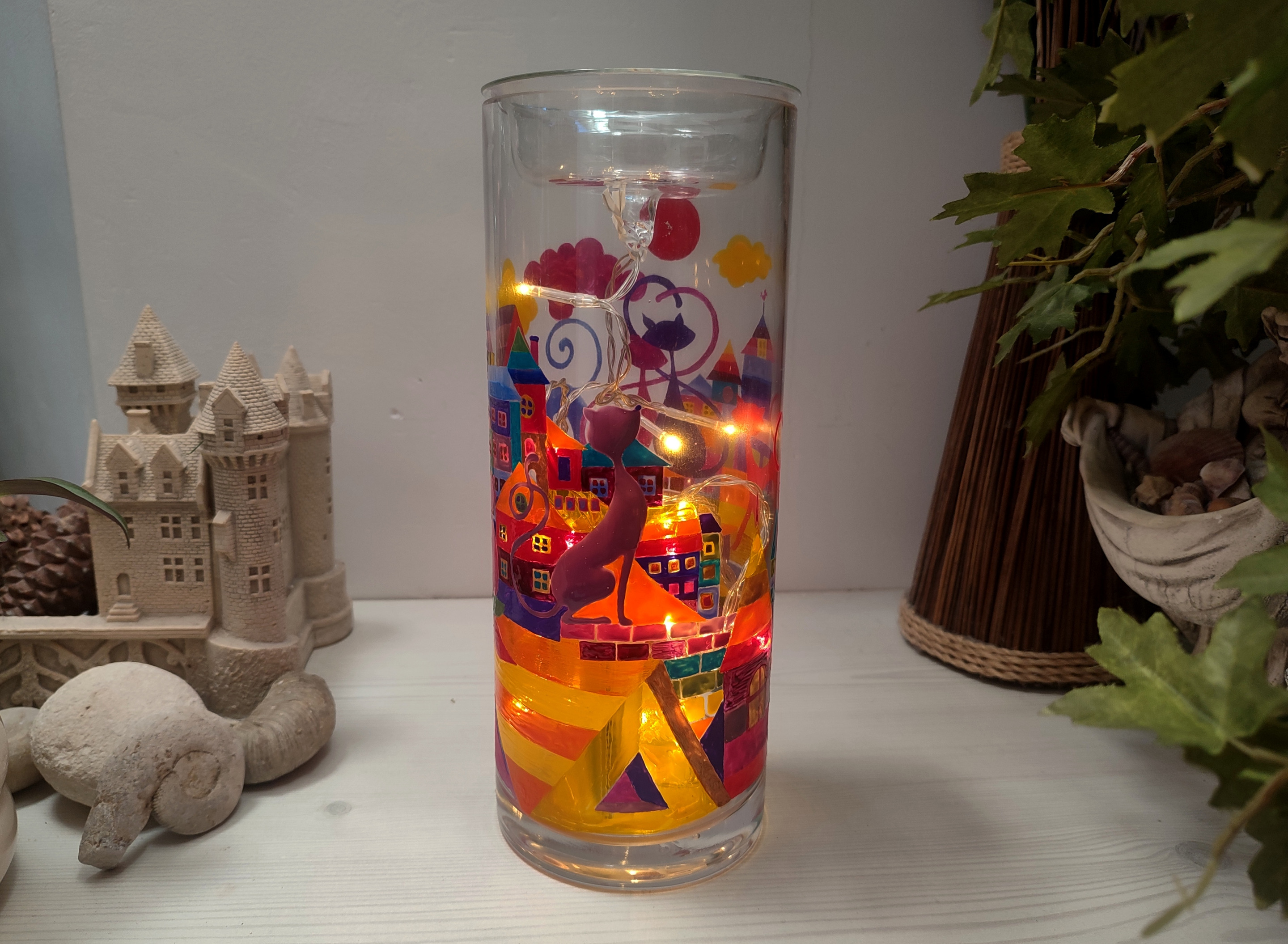 Luminaire original entièrement peint à la main sur le thème de nos amis félins, les chats. Cet objet est multifonction pour 3 usages en un: vendu avec une guirlande de 20 petites leds (piles non fournies), l'intérieur de l'objet peut être éclairé, l'ambiance de votre intérieur devient alors plus douce et chaleureuse....(ou chat heureux!) Surmonté d'un photophore, celui-ci peut être enlevé ce qui permet de transformer cet objet en vase.