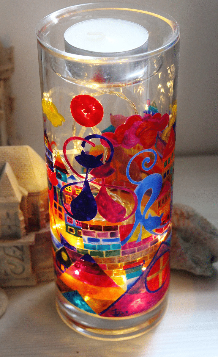 Très Jolie Lampe Photophore Vase Décoré À La Main Sur Le Thème Des Chats Pour 3 Usages En Un, Pièce Unique Signée Et Numéroté.