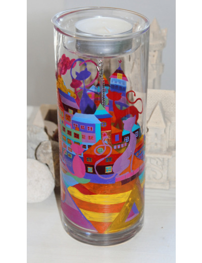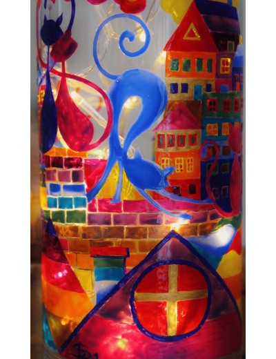 Luminaire original entièrement peint à la main sur le thème de nos amis félins, les chats. Cet objet est multifonction: vendu avec une guirlande de 20 petites leds (piles non fournies), l'intérieur de l'objet peut être éclairé, l'ambiance de votre intérieur devient alors plus douce et chaleureuse....(ou chat heureux!) Surmonté d'un photophore, celui-ci peut être enlevé ce qui permet de transformer cet objet en vase.