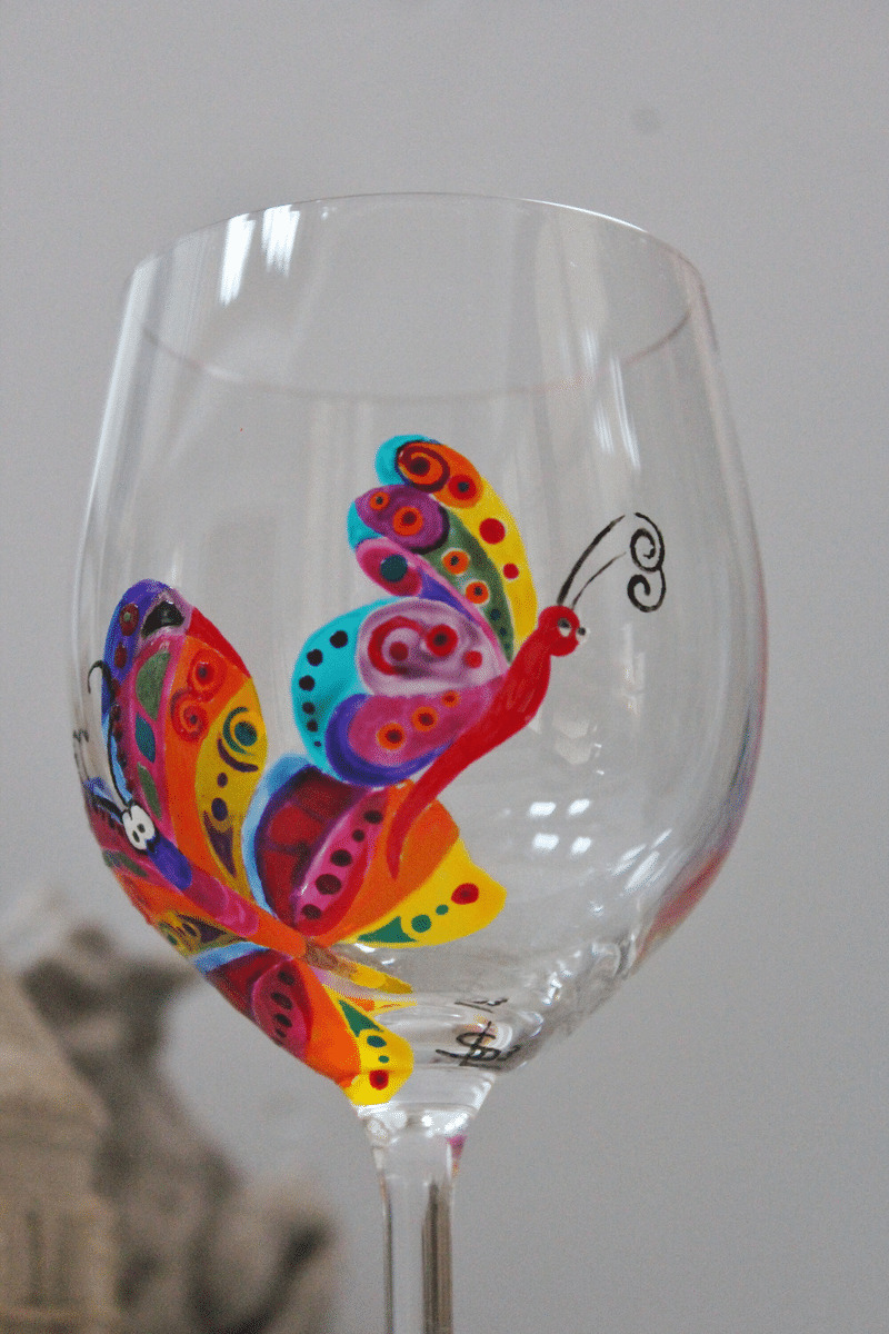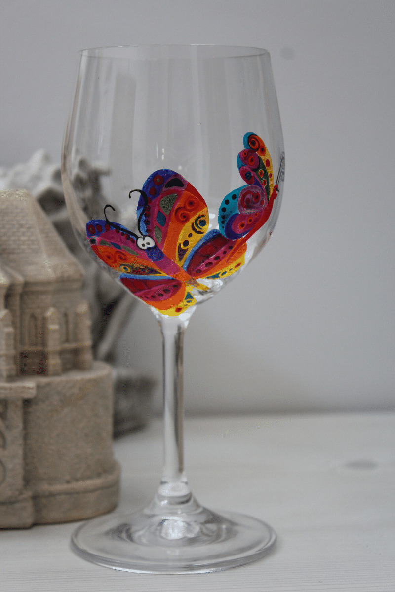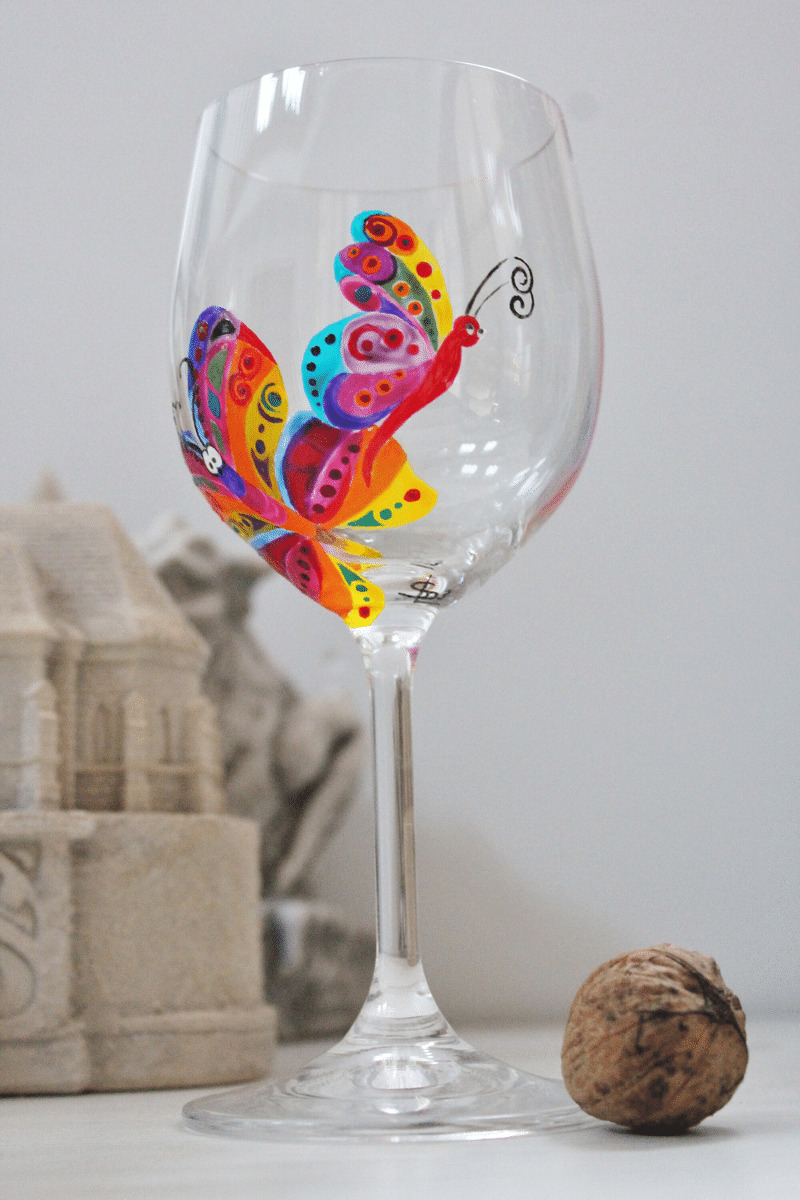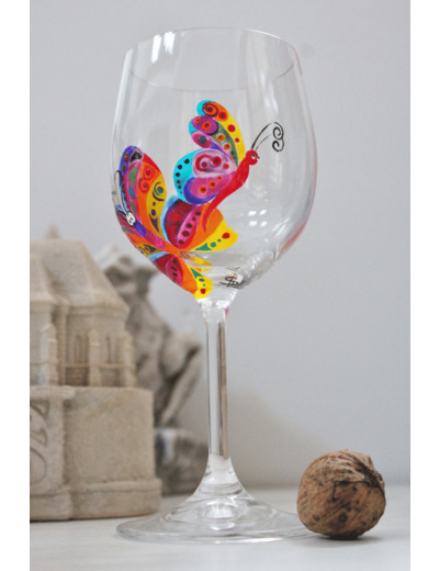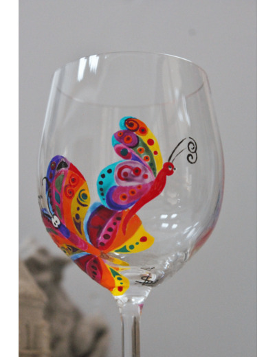 Verre À Pied Ballon Peint À La Main Et Personnalisé Sur Le Thème Des Papillons En Cristal De Bohème Très Coloré, Pièce Unique Et Artisanale.