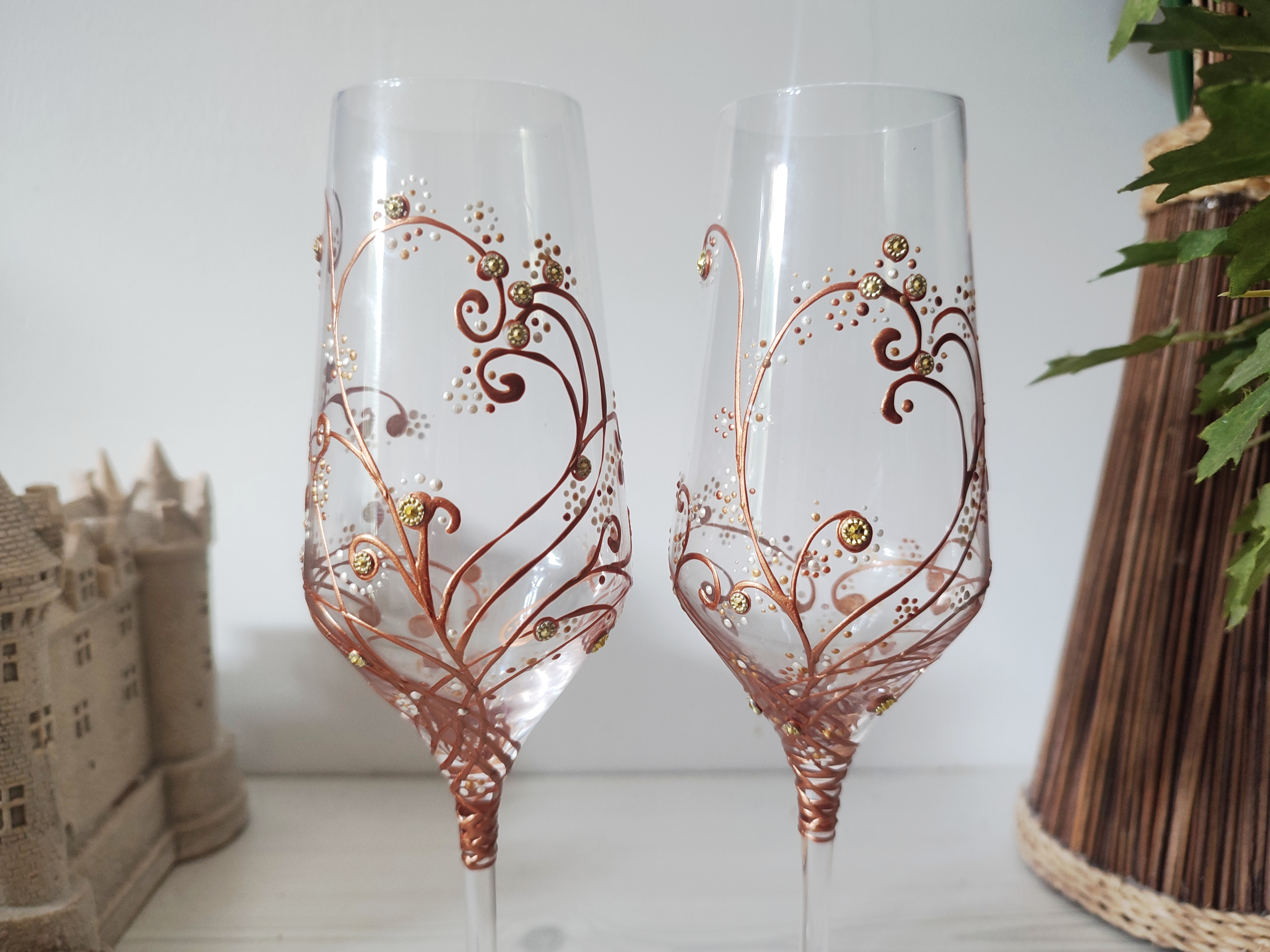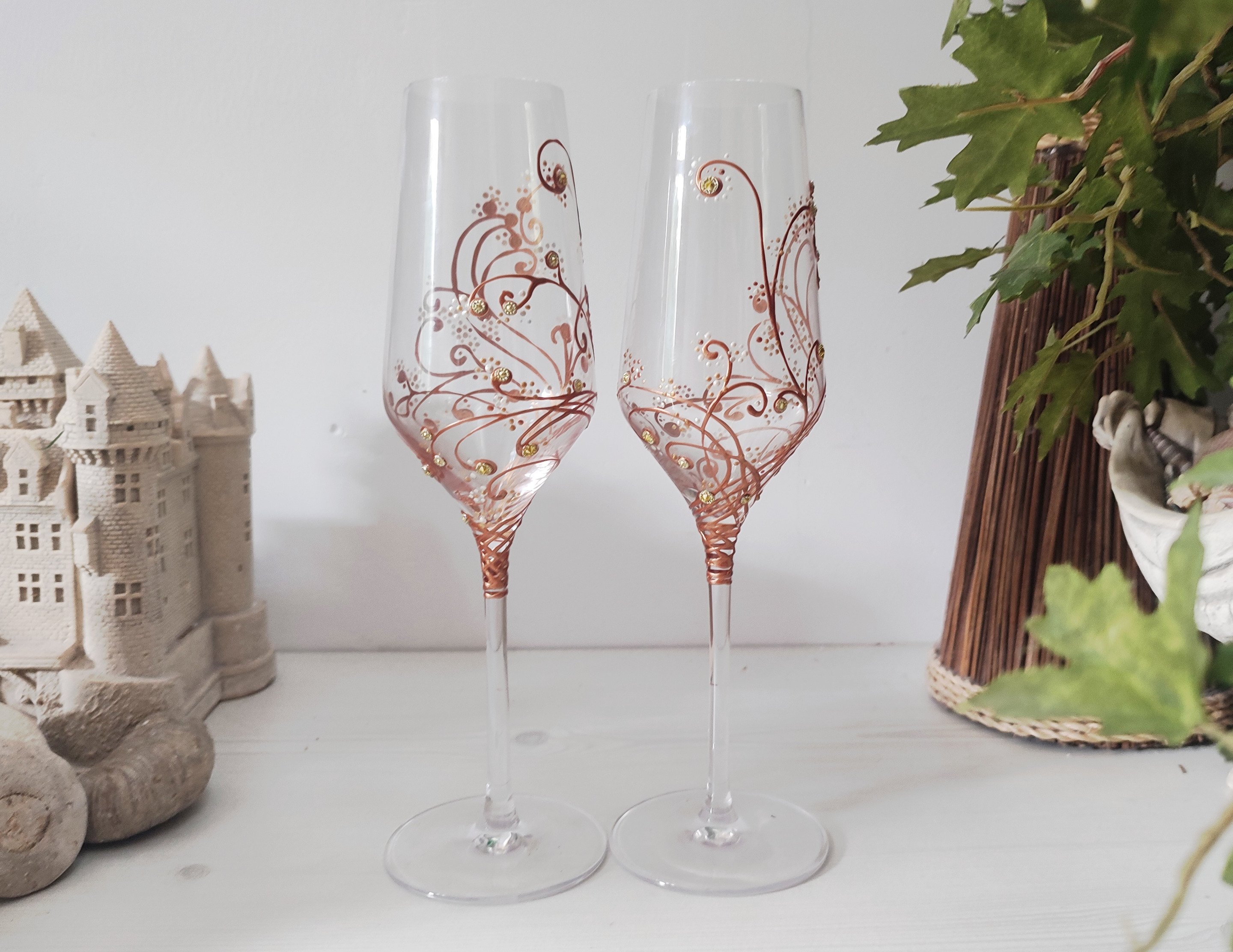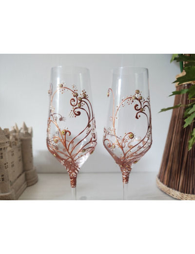 Lot de deux flutes à champagne originales personnalisables peintes à la main, décorées de volutes dorées en forme de cœur et agrémentés de petites fleurs blanches et cuivrées. Un serti en forme de spirale court le long du pied du verre.