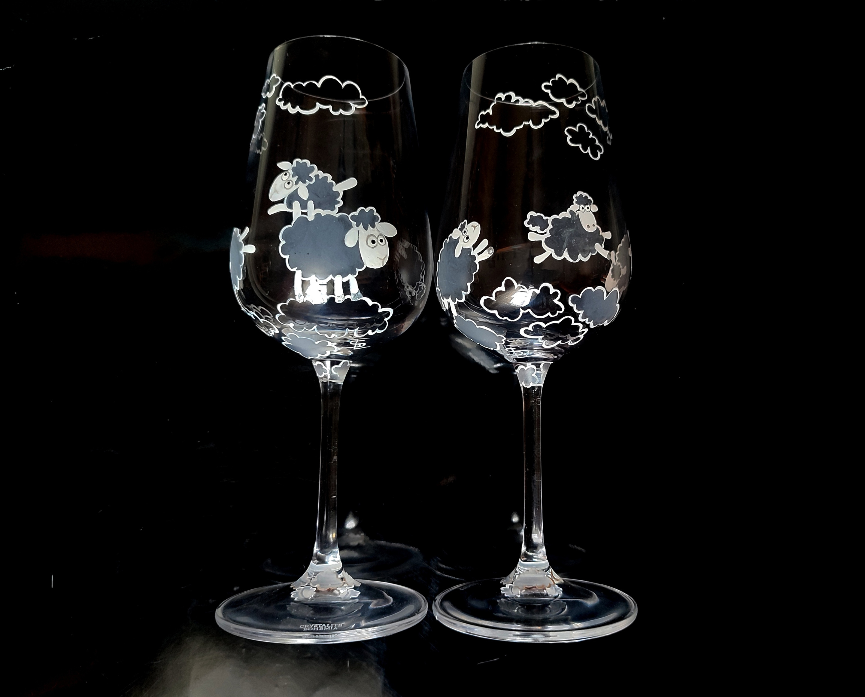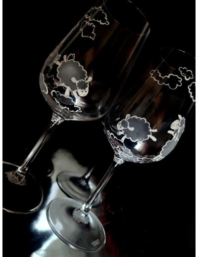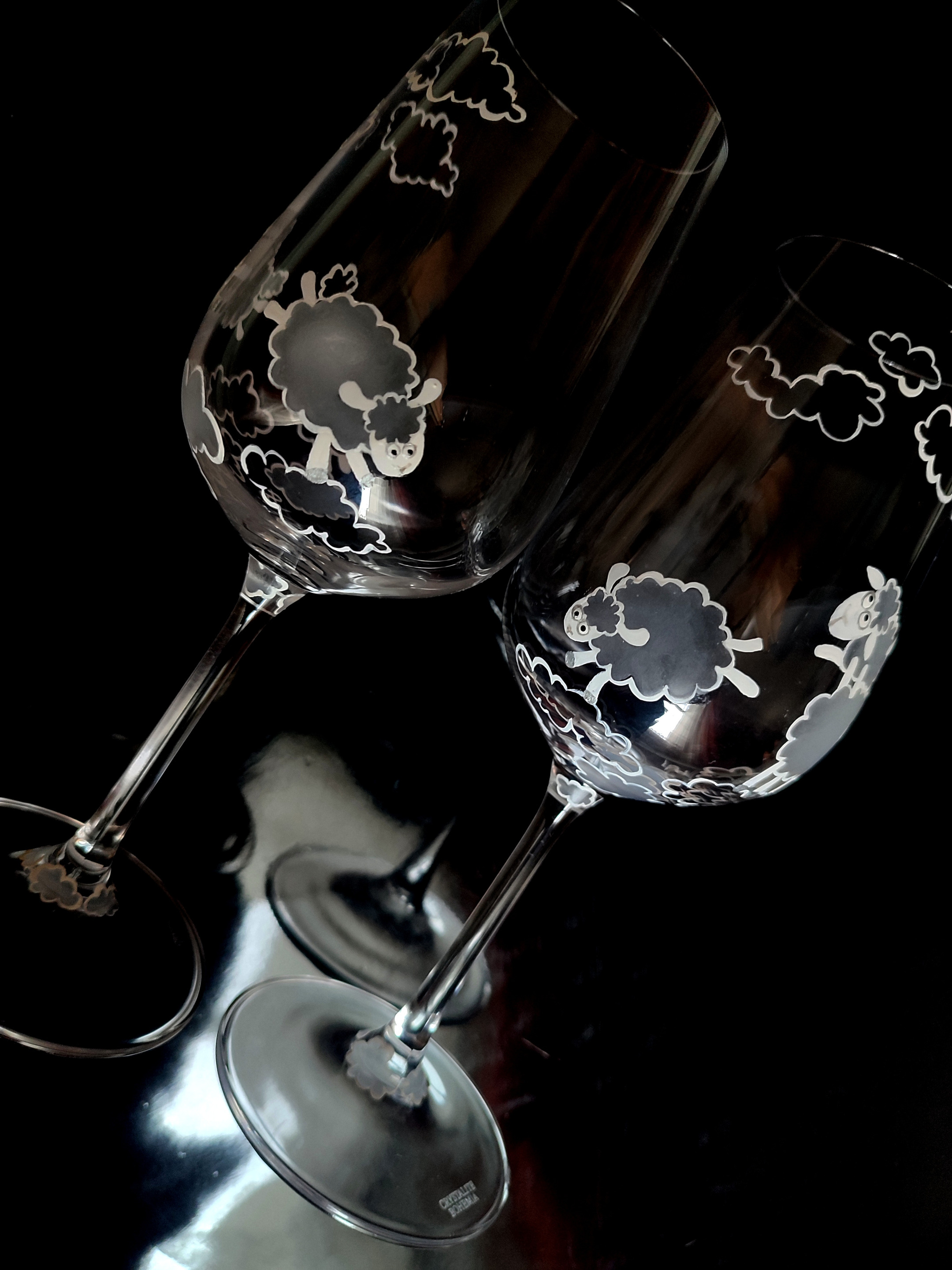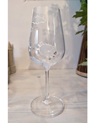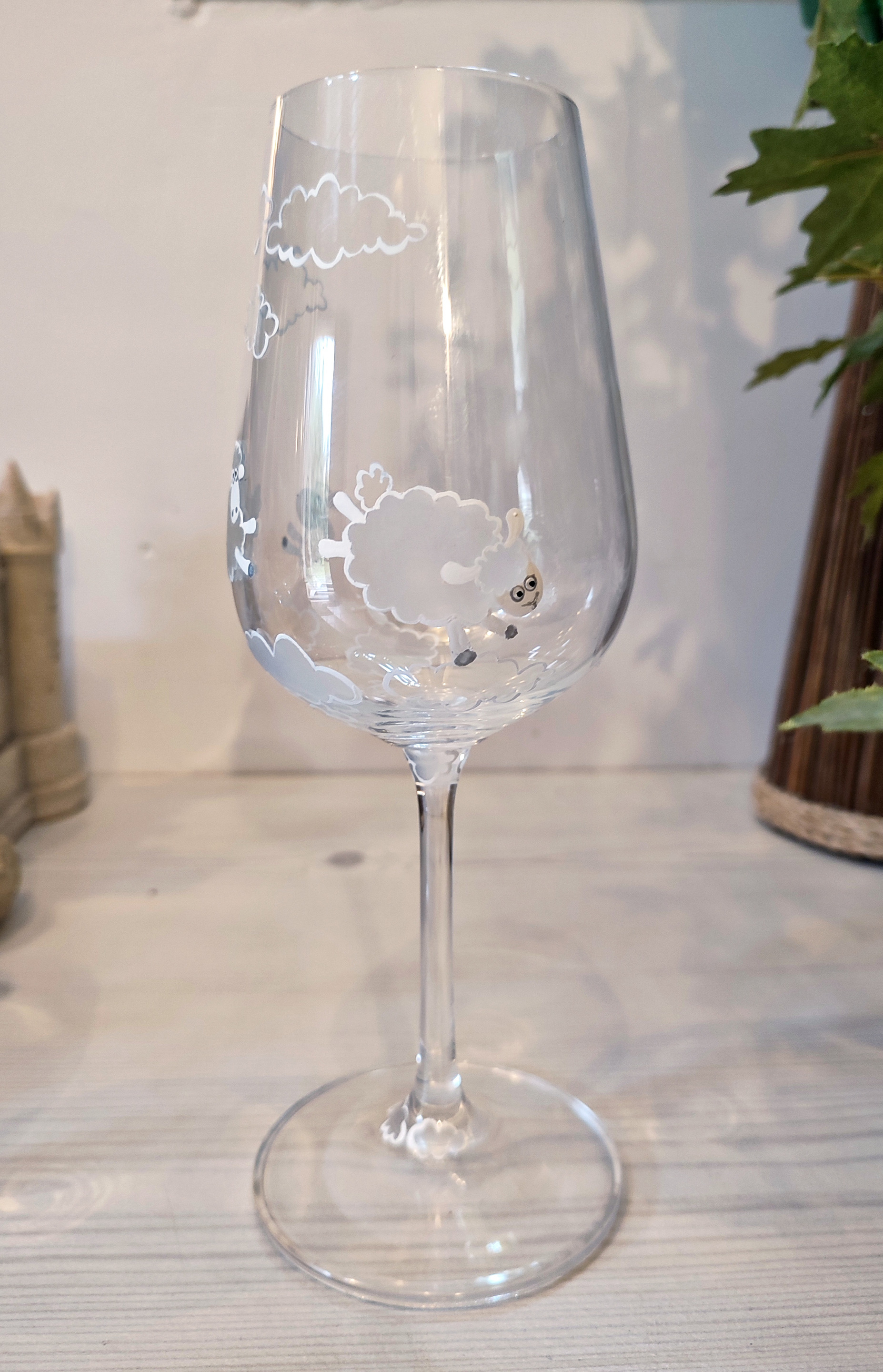 Jolis grands verres à vin en cristal très élégants ou une colonie de petits moutons blancs s'amusent à jouer à saute mouton dans les nuages.