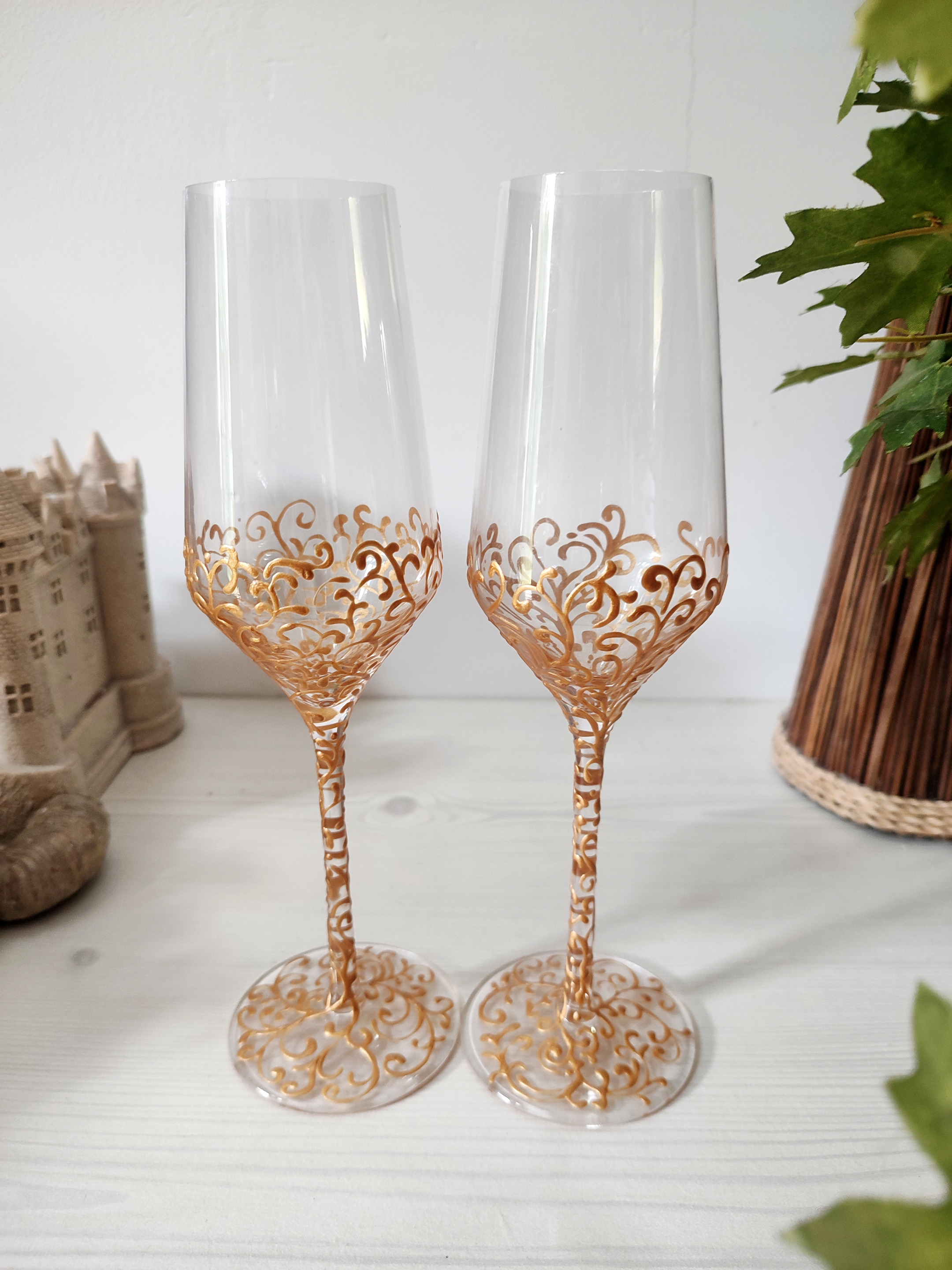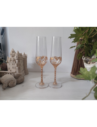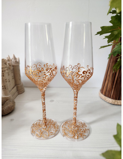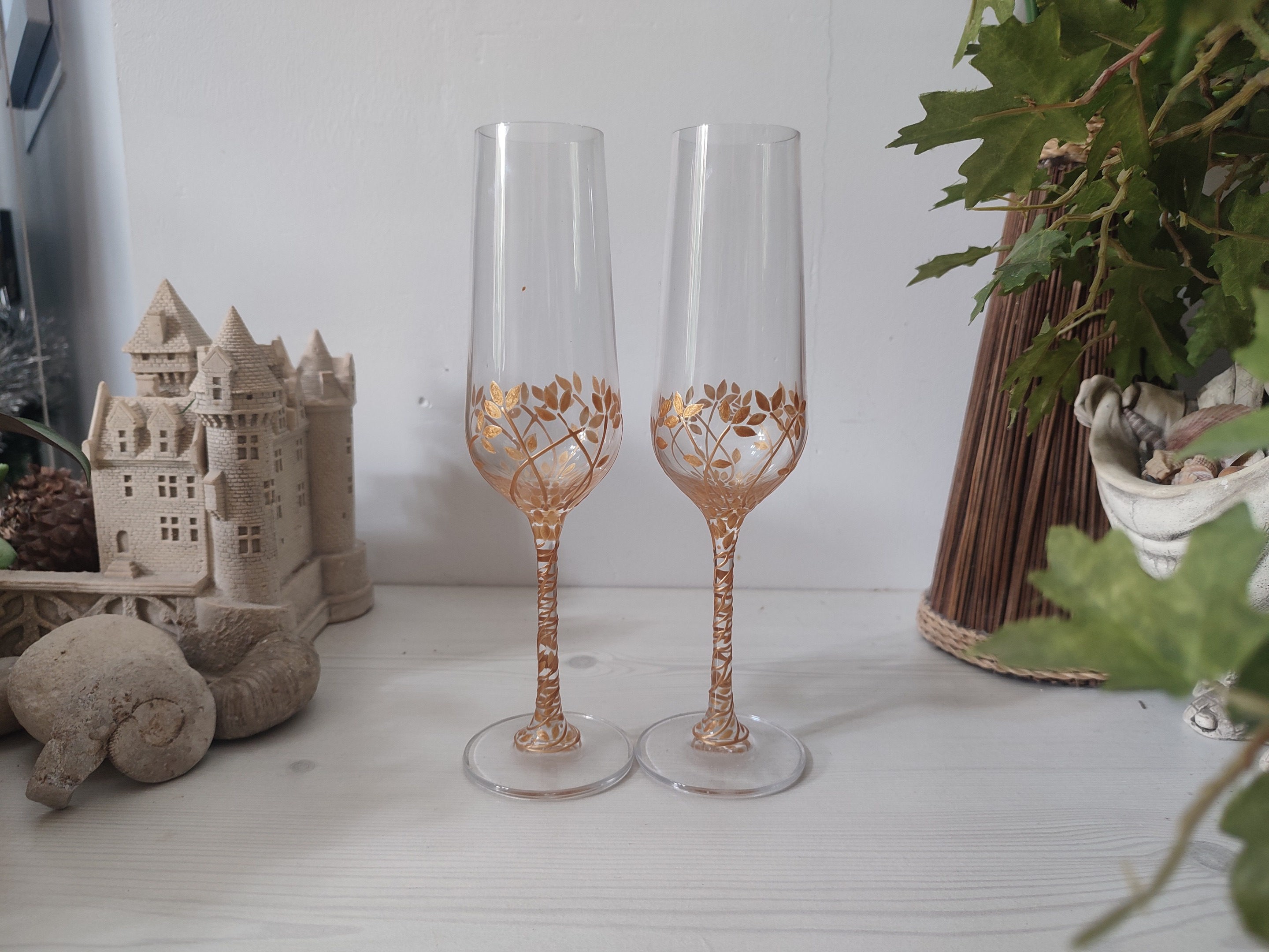 Quel joli cadeau de mariage que ces deux jolies flûtes à champagne dorées en cristal de bohème et peintes à la main.