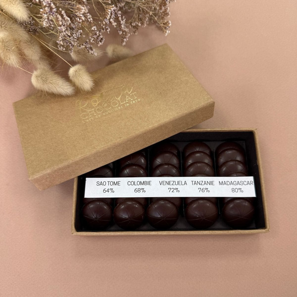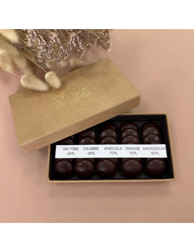 CONTENU : 30 chocolats - Sao Tomé 64%, Colombie 68%, Venezuela 72%, Tanzanie 76%, Madagascar 80%