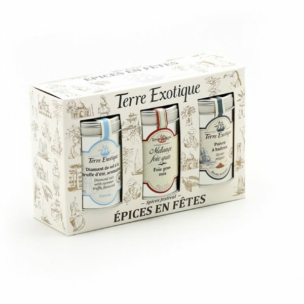 Ce coffret regroupe 3 produits indispensables pour les fêtes ! Retrouvez le diamant de sel à la truffe d’été aromatisé, l’assemblage pour foie gras et enfin, le fameux poivre à huîtres.