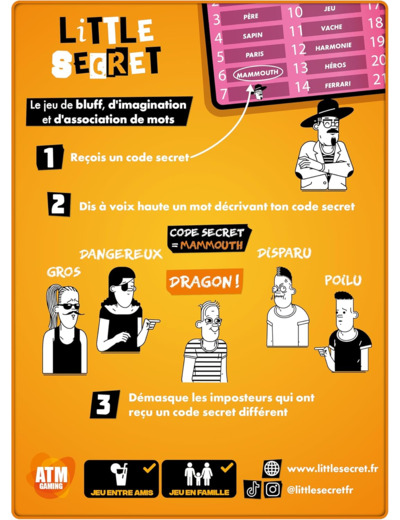 Votre mission : trouver qui ment sans révéler votre propre mot. Un jeu de déduction sociale et de communication subtile, parfait pour les amateurs de bluff !
