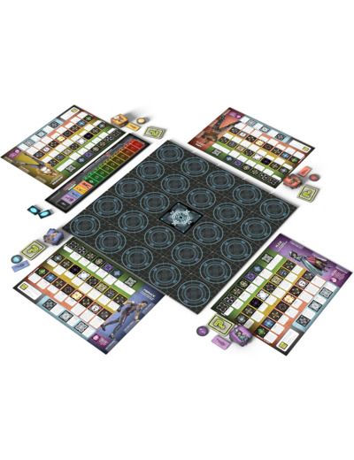 Salles modulaires, pions Personnage, figurines, cartes Action, livrets, modules et extensions intégrées