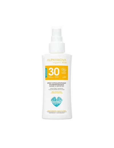 Crème spray solaire hypoallergénique format voyage SPF30 90g Alphanova référencé sur Mondebio.