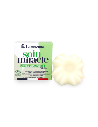 Vous souhaitez démêler vos cheveux tout en douceur sans les alourdir ? Vous voulez retrouver une chevelure en bonne santé et pleine de vigueur ? L'après shampoing solide soin démêlant Lamazuna est fait pour vous. Bio, vegan et fabriqué en France, c'est le produit idéal ! Vos cheveux seront plus brillants et faciles à coiffer. Sa texture fondante s'applique sans effort sur tous types de cheveux. L'utilisation de cet après-shampoing est particulièrement préconisé si vos cheveux sont secs et difficiles à démêler. L'après shampoing solide soin démêlant Lamazuna, c'est la garantie de cheveux plus souples, plus doux et plus forts dès la première utilisation. Ses actifs démêlants lissent la fibre capillaire afin de faciliter le brossage et d'éviter la formation de noeuds. Respectueux de votre santé et de l'environnement, l'après-shampoing solide soin démêlant est entièrement composé d'ingrédients naturels. Sa forme solide et compacte permet une grande facilité d'utilisation. Facile à transporter, il vous accompagnera partout. Cet après-shampoing solide sera l'allié cosmétique 100% NA-TU-REL de votre beauté.