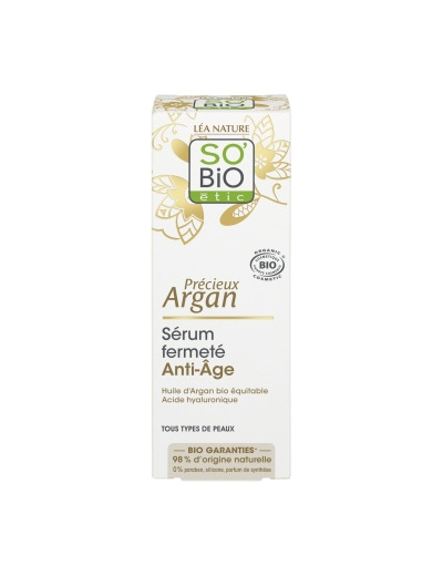 Le Sérum Fermeté anti âge Précieux Argan 30ml So Bio Etic raffermit et aide à l'action anti-âge des peaux dévitalisées.