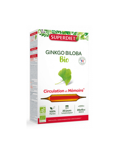 Pour fabriquer super diet Ginkgo Biloba Bio Circulation Mémoire 20 ampoules de 15ml, on utilise des feuilles de ginkgo car elles contiennent du terpène, des acides ginkgoliques, des polyphénols ainsi que des hétérosides flavoniques.