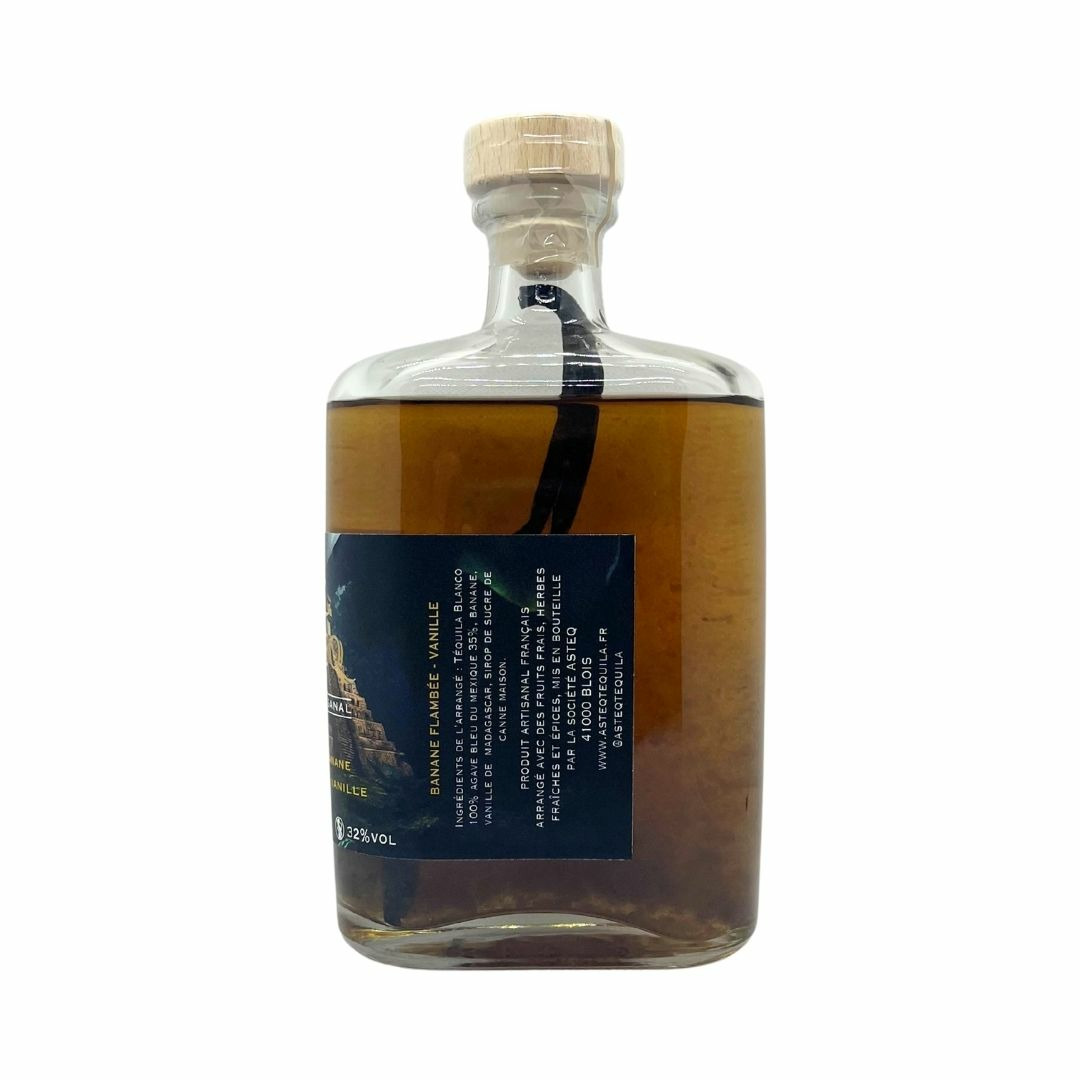 Alerte gourmandise ! ASTEQ revisite la célèbre banane flambée : une Tequila Blanco 100 % Agave Bleu macère plusieurs mois avec des bananes fraîches légèrement flambées, des gousses de vanille de Madagascar et un sirop de canne maison. Résultat : une « arrangée » ronde, caramélisée, aux accents pâtissiers irrésistibles. À savourer les yeux fermés !
