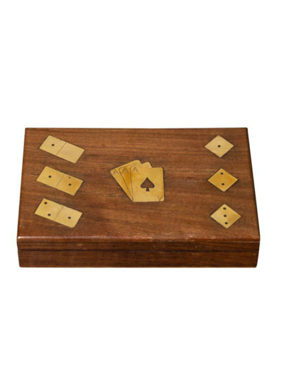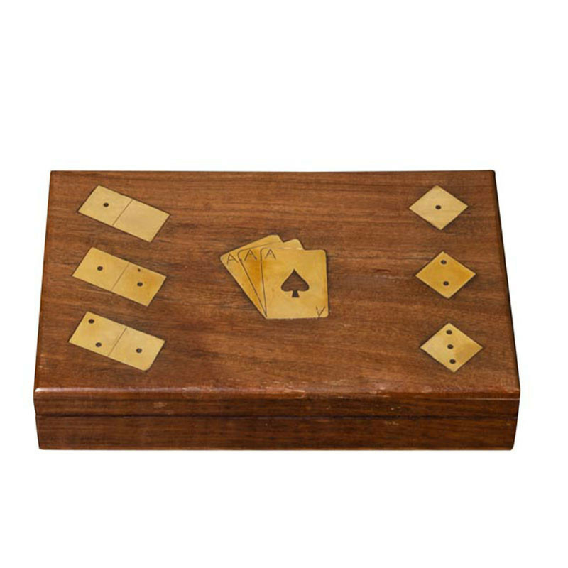 Incrustations en Laiton : Le couvercle est orné de motifs en laiton finement ciselés représentant des cartes, des dés et des dominos, permettant d'identifier le contenu tout en ajoutant une touche de brillance dorée.