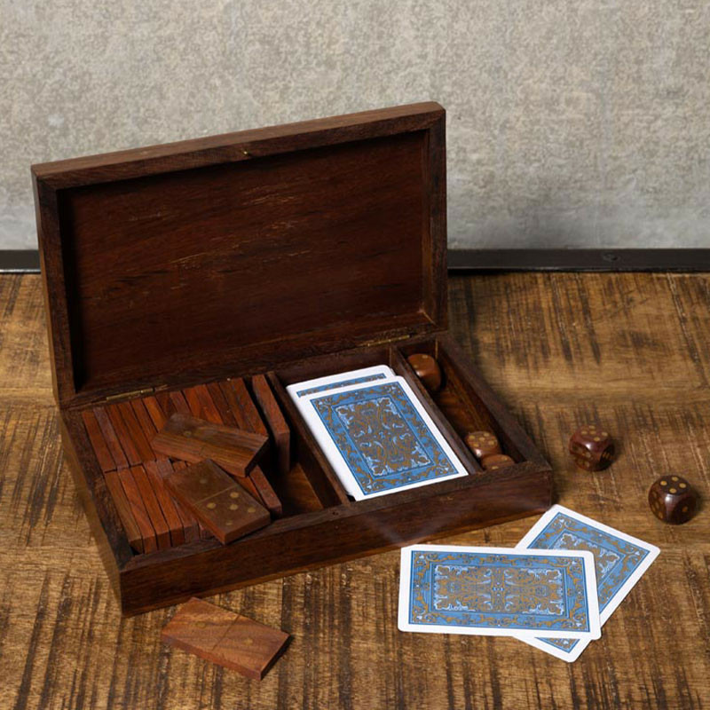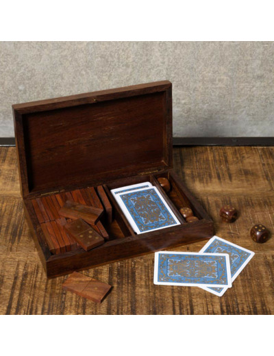 Compartimentage Intelligent : À l'intérieur, des espaces dédiés permettent de ranger soigneusement le jeu de cartes, les dominos en bois coordonnés et les dés, évitant ainsi tout désordre.