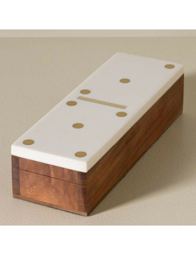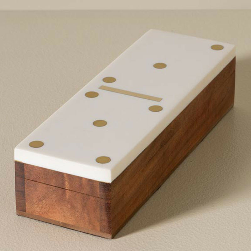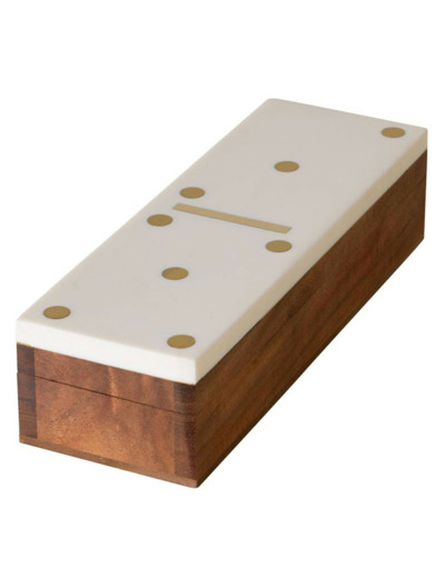 Le Couvercle : Sa finition blanche lisse évoque la finesse de l'ivoire ou de la nacre. Il est décoré de points et d'une barrette centrale en laiton, reprenant le motif d'un domino géant.