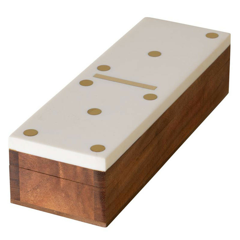 Les Pièces de Jeu : À l'intérieur, vous découvrirez des dominos blancs aux finitions soignées, offrant un contraste parfait avec le bois sombre de l'acacia.