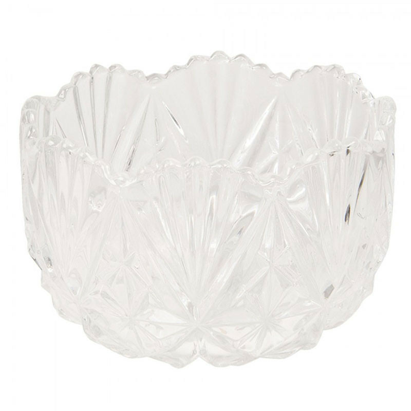 Placée au centre de la table, elle attire le regard grâce à son design taillé en losanges et étoiles qui réfracte la lumière avec éclat.