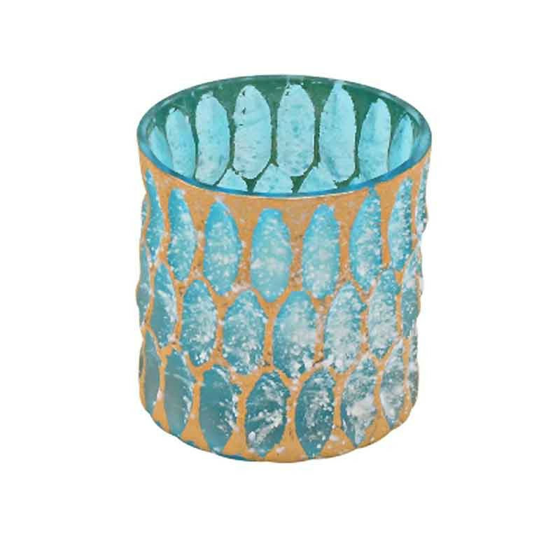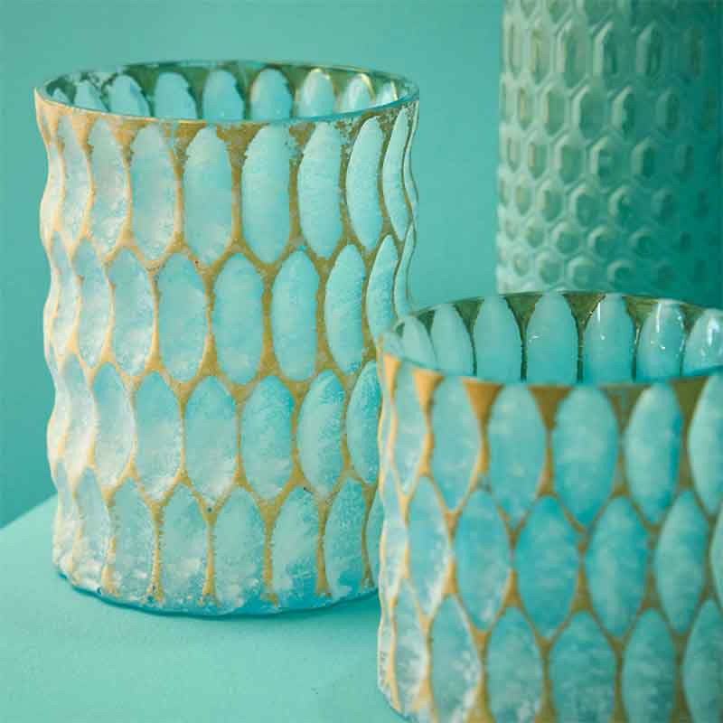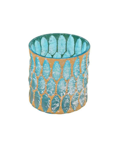 Dans un salon, ce photophore en verre bleu peut être placé sur une table basse, un buffet ou une console afin de créer un point lumineux subtil. Associé à des objets en bois naturel, en métal doré ou en céramique, il accentue le charme d’une décoration chic et soignée. En soirée, une bougie allumée à l’intérieur apporte une ambiance tamisée et cosy, parfaite pour des instants de détente.