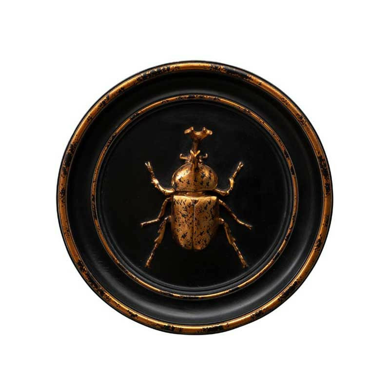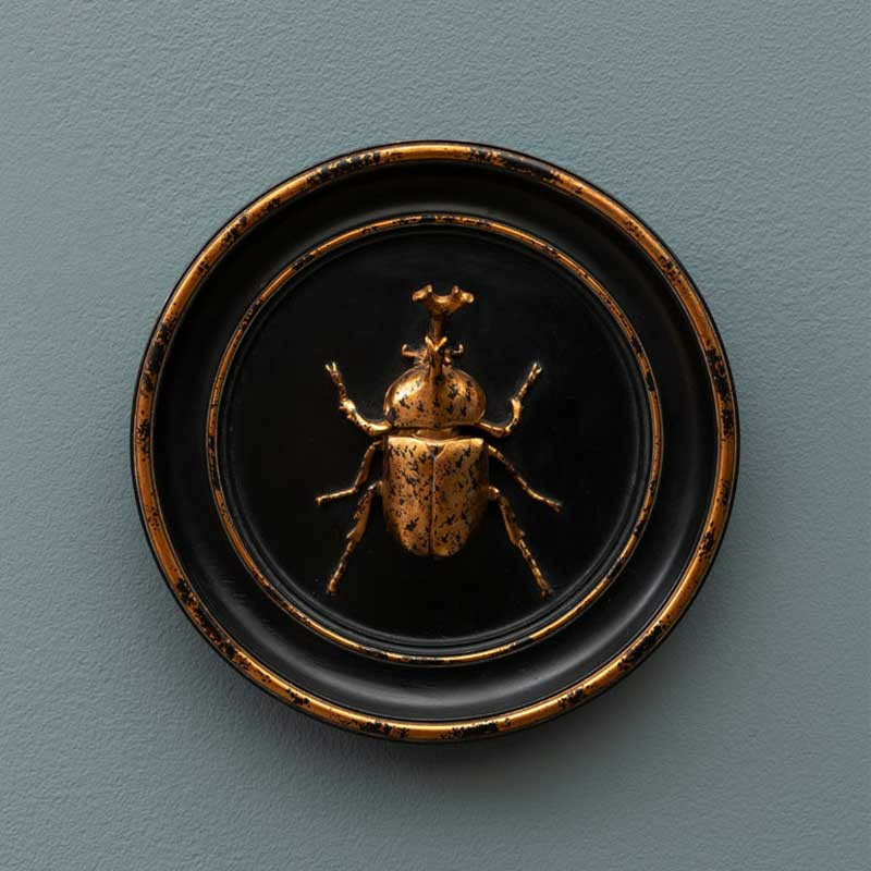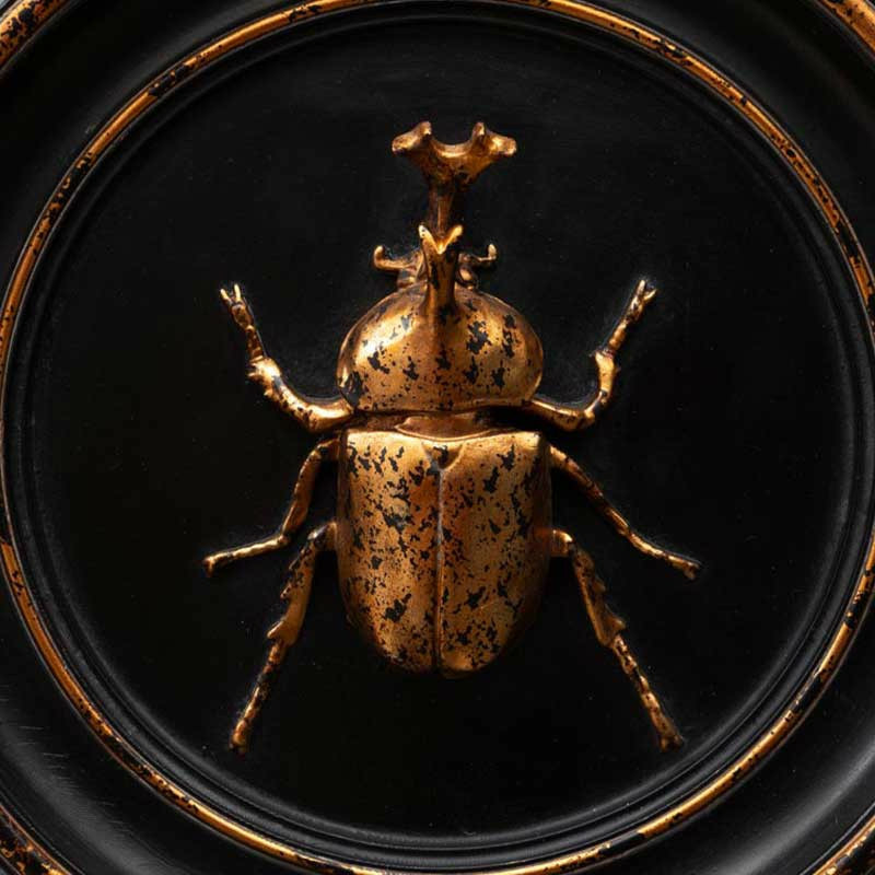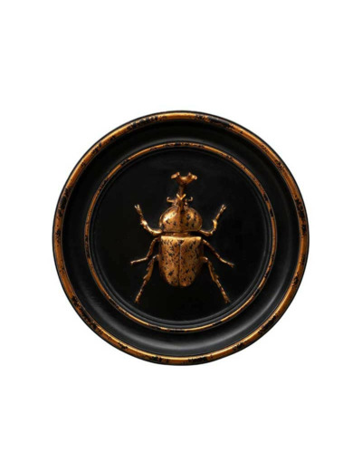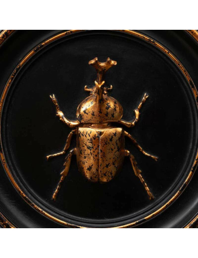 Pour une déco chic et tendance, optez pour ce cadre rond en résine noir et doré vieilli avec un scarabée rhinocéros, une pièce unique qui allie élégance exotique et charme vintage.