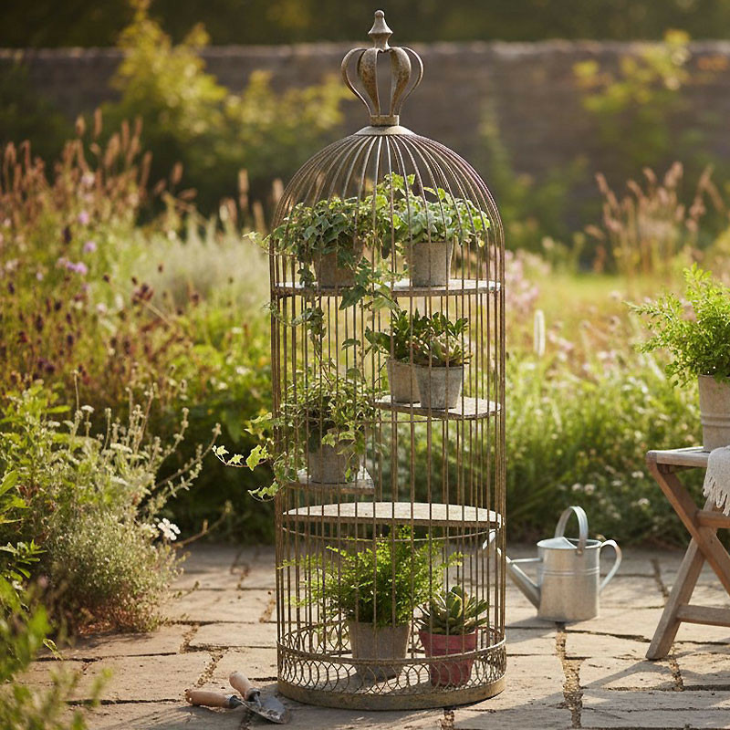 Placez-le à côté d'un fauteuil de jardin ou d'un banc, avec des plantes retombantes ou des géraniums sur les étagères.
