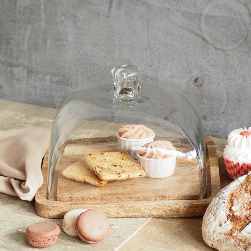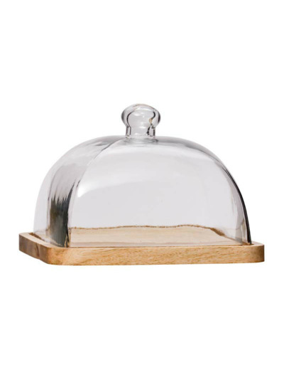 Cette cloche en verre et son plateau en bois de manguier forment un ensemble chaleureux et moderne.
