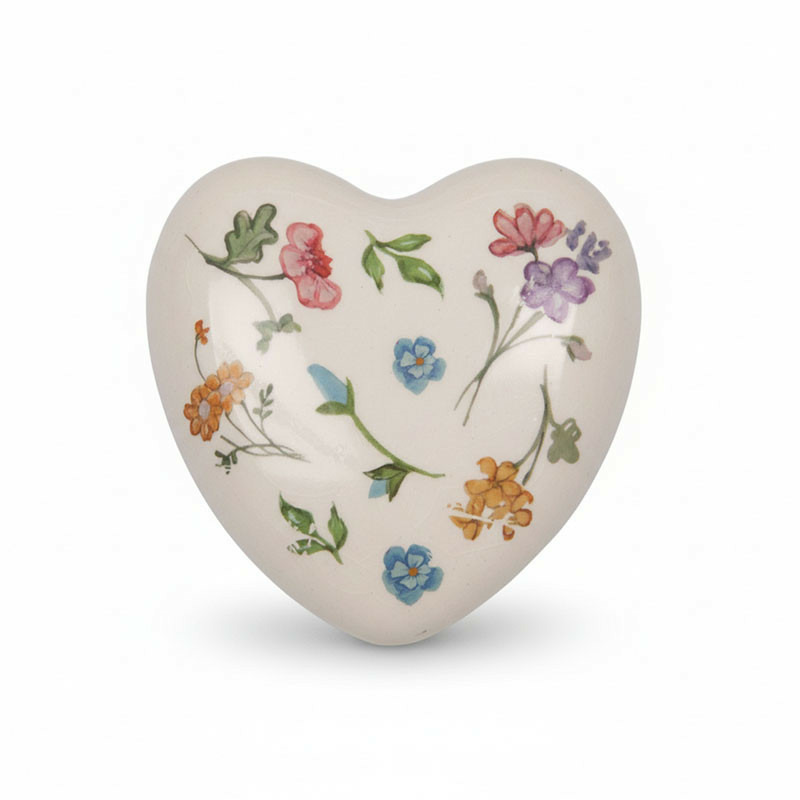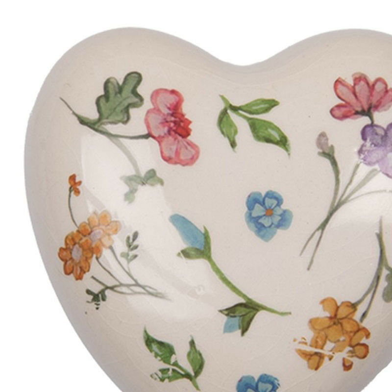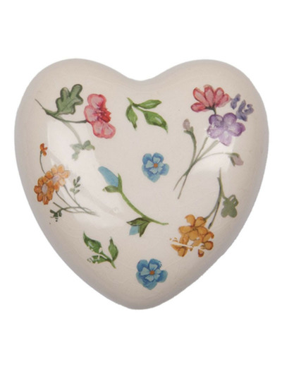 Cet objet décoratif est conçu pour être posé sur une surface plane, apportant une note romantique à tout espace. Sa surface en céramique est émaillée pour une finition lustrée et met en évidence de délicates illustrations de fleurs sauvages (roses, coquelicots petites fleurs bleues) dans des tons pastel. Le coeur, légèrement bombé, est agréable au toucher et facile à intégrer dans divers décors.
