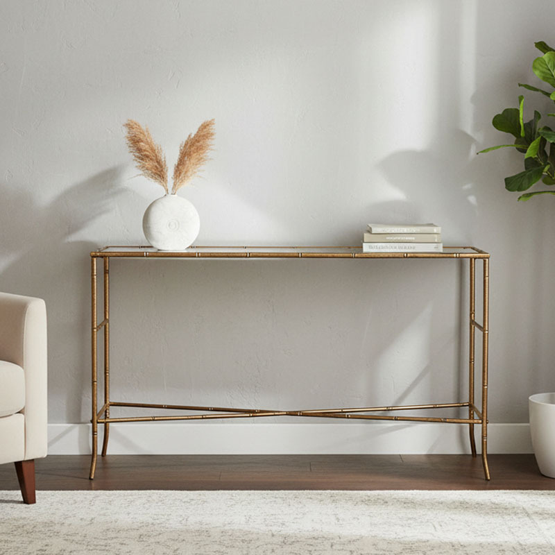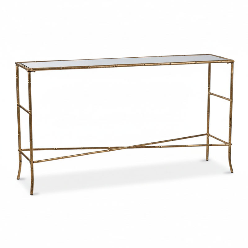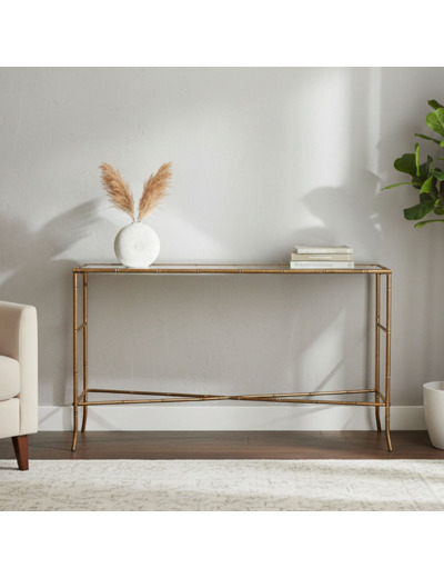 Console raffiné en métal doré, rehaussée d'un plateau en verre, alliant glamour et modernité. Une pièce élégante qui ajoute une touche luxueuse à tout intérieur.