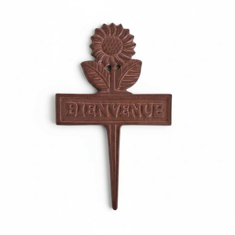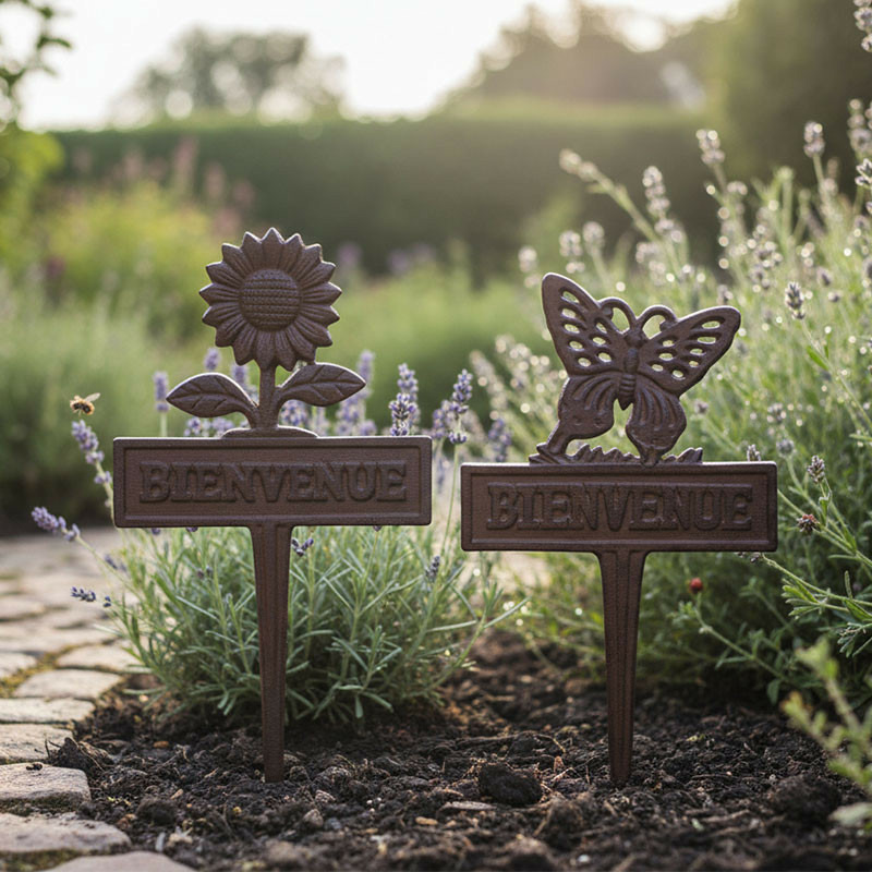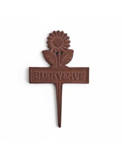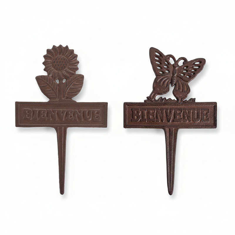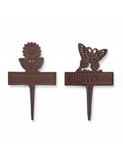 Créez un coin accueillant et plein de caractère avec ce duo de piquets en fonte au message "Bienvenue". Leur design travaillé, l'un surmonté d'un papillon et l'autre d'un tournesol en fait de véritables éléments décoratifs à planter où bon vous semble : à l'entrée d'une allée, dans un bac fleuri sur une terrasse ou près d'un banc au fond du jardin.