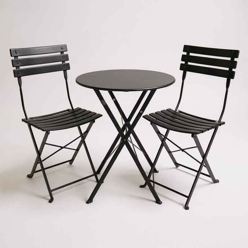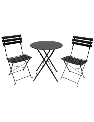 Découvrez notre ensemble de table de jardin en fer noir, pliable et résistant aux intempéries, livré avec deux chaises assorties.