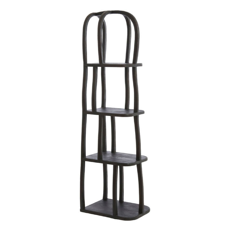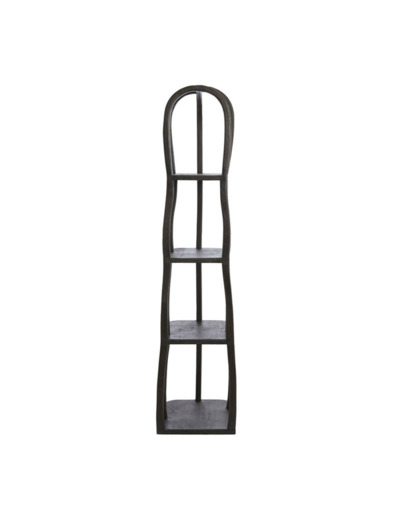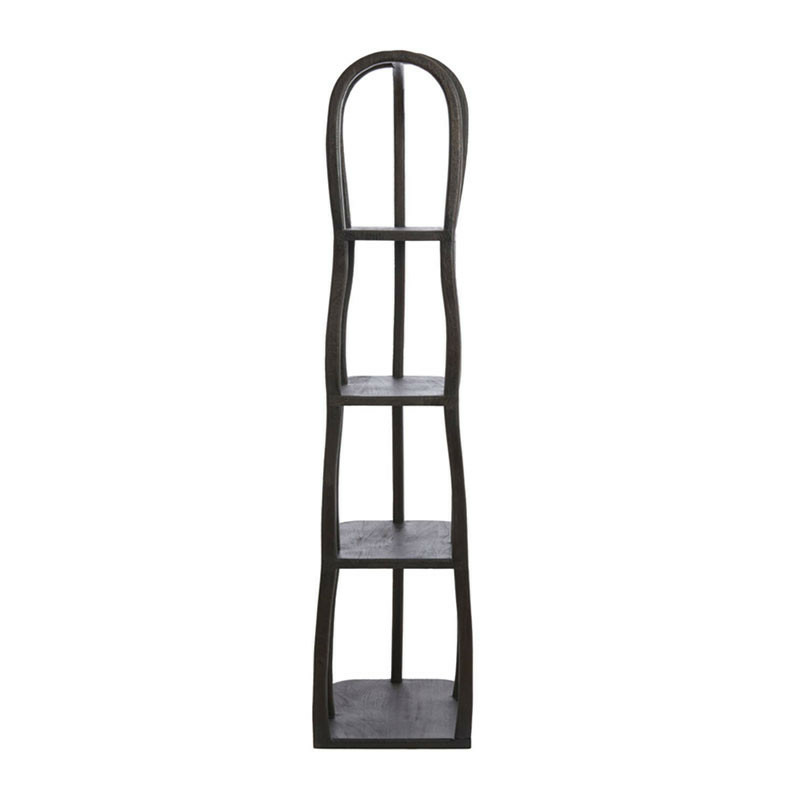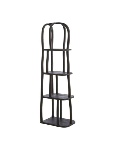 Pour souligner l'aspect organique de ce cabinet, installez-le sur un mur aux tons clairs ou texturé (type chaux ou lin). Il s'intègre parfaitement dans une décoration de style Moderne Organique, entouré de matières brutes comme le grès, la pierre ou le jute. Pour la décoration des étagères, privilégiez des objets aux formes douces et des éléments végétaux pour créer un contraste harmonieux avec sa structure en bois sombre.