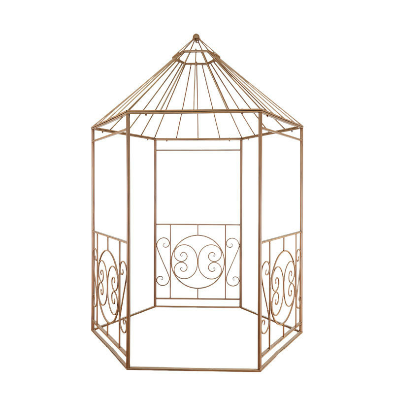 Cette tonnelle romantique, de par sa structure octogonale et son allure en fer forgé, mérite une place de choix pour maximiser son impact esthétique et pratique.