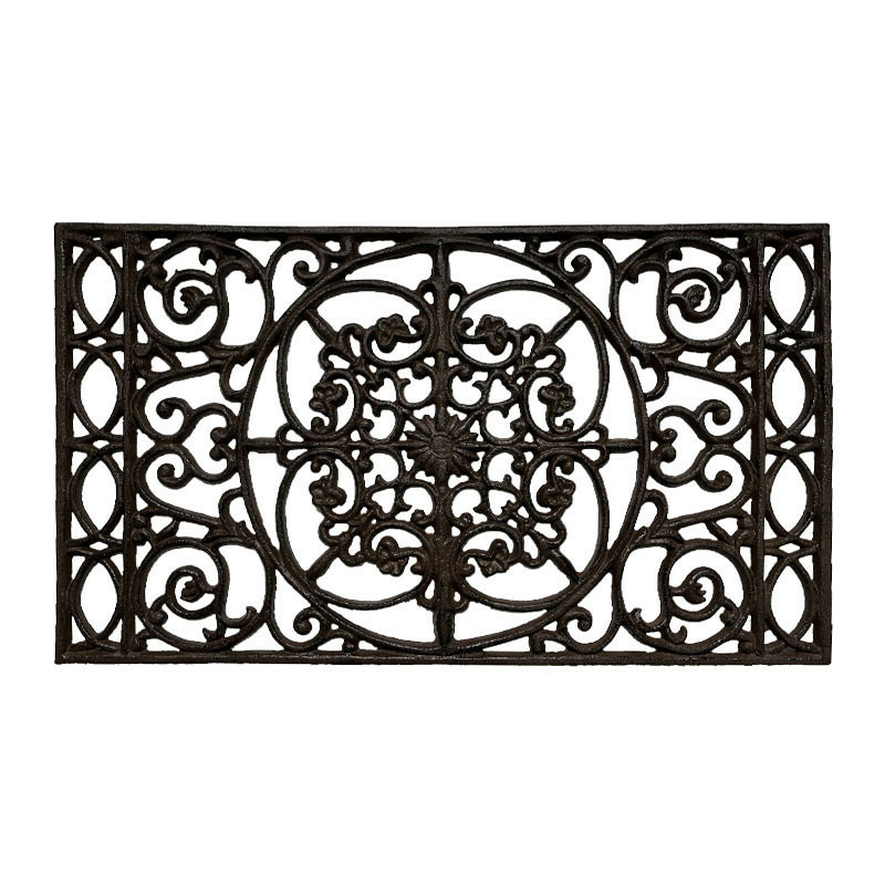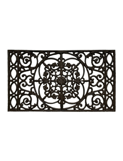 Ce gratte-pieds en fonte marron se place facilement devant une porte d'entrée.