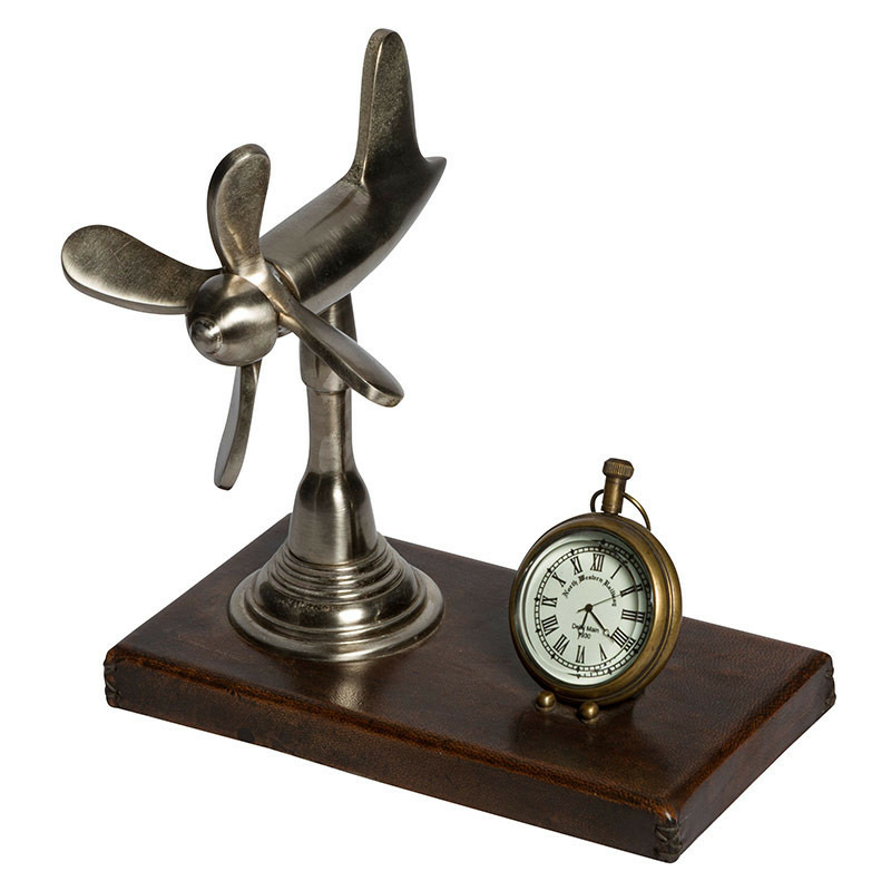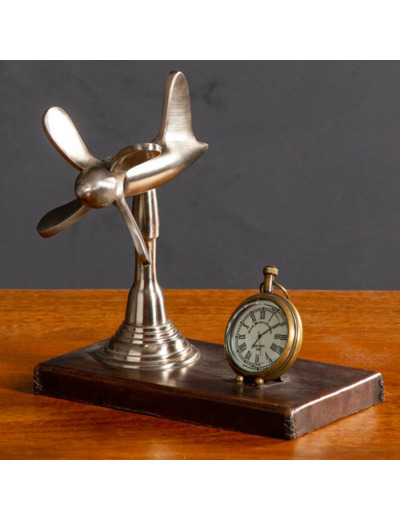 Cette horloge sur socle en cuir est pour le moins atypique, elle dispose d'une petite horloge style gousset et d'une décoration d'hélice sur base. Posé sur un bureau, un buffet ou une cheminée elle apporte un style décalé et moderne à votre intérieur.