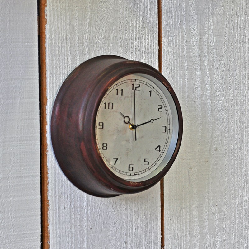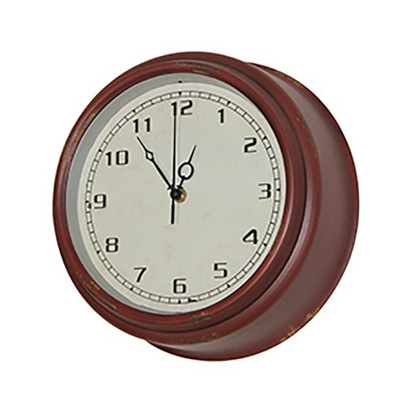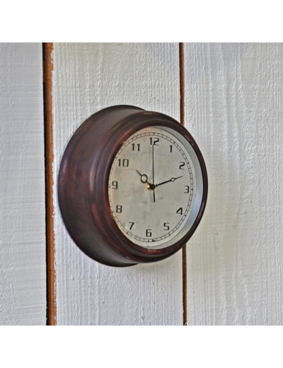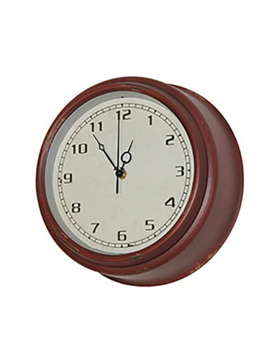 Superbe horloge vintage en fer couleur carmin. Fond du cadran couleur crème vieilli effet craquelé.