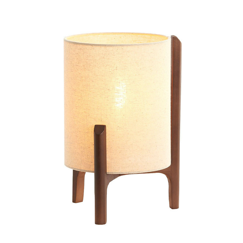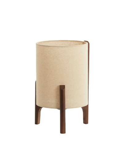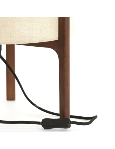 La structure de la lampe, en forme de trépied, est fabriquée en bois massif aux teintes sombres qui contrastent magnifiquement avec la clarté de l'abat-jour. Ce dernier est réalisé en tissu écru ou lin de couleur naturelle, offrant une texture douce.