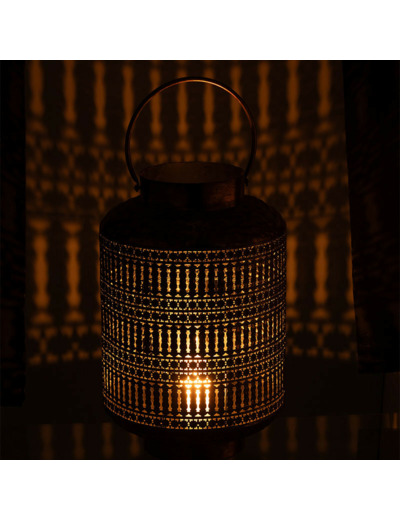Cette lanterne est conçue pour être une source de lumière d'ambiance, et non un éclairage principal. Lorsque la bougie est allumée, le motif ajouré projette des ombres géométriques sur les surfaces environnantes, créant une atmosphère magique et immersive.